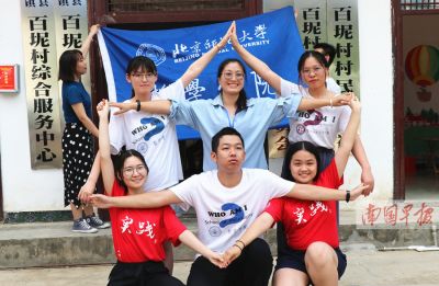 黄文秀(后排中)生前组织北京师范大学的校友来到驻点村开展志愿服务活动。百色市委宣传部供图