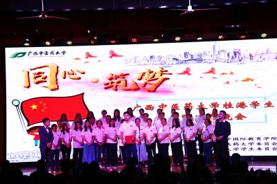 为激励和引领广大青少年大力弘扬以爱国主义为核心的伟大民族精神, 坚定 “一国两制” 信念,促进香港和内地学生的相互了解,广西中医药大学“同心·筑梦”桂港学生联谊暨迎新晚会于2019年9月25日晚在该校仙葫校区大学生活动中心A座小礼堂内隆重举行。此次活动由广西中医药大学国际教育学院、团委、学生会主办,得到了香港特区政府驻广西联络处和共青团广西区委的大力支持。香港特区政府驻广西联络处主任吴嘉俊、副主任周德智、共青团广西区委统战和对外交流部部长杨志玲、副部长唐洁与该校党委副书记何并文、副校长戴铭等出席本场晚会。