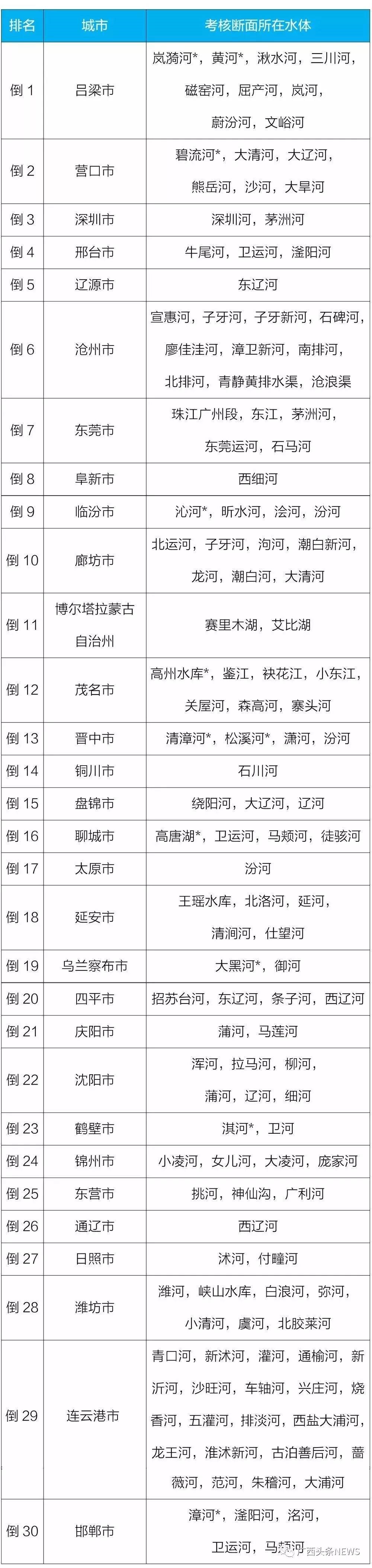 质量状况排名后30位城市及所在水体