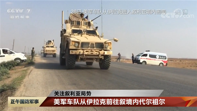 10月26日,在叙利亚北部,一支美军车队被发现正从卡米什利前往代尔祖尔。路透社称,这意味着这支美军车队很可能是从伊拉克入境叙利亚。美国国防部长埃斯珀25日曾在布鲁塞尔北约总部表示,美国不会把所有在叙利亚的美军士兵完全撤出,而是会在当地保留一支机械化部队,以防止叙利亚代尔祖尔省的油田落入极端组织手中。