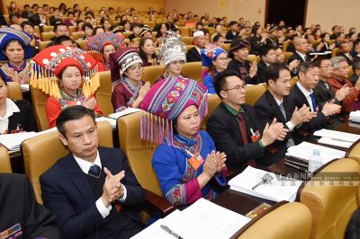 1月12日,自治区十三届人大三次会议在广西人民会堂开幕,代表们在听取政府工作报告时热烈鼓掌。记者 邓 华摄