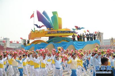 2019年10月1日上午,庆祝中华人民共和国成立70周年大会在北京天安门广场隆重举行。这是群众游行中的“人类命运共同体”方阵。 新华社记者 孟永民 摄