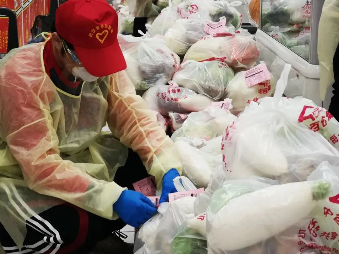 2020年,在抗击新冠肺炎疫情狙击战中,武汉青年志愿者在中百仓储百步亭花园路店参与商超志愿服务。