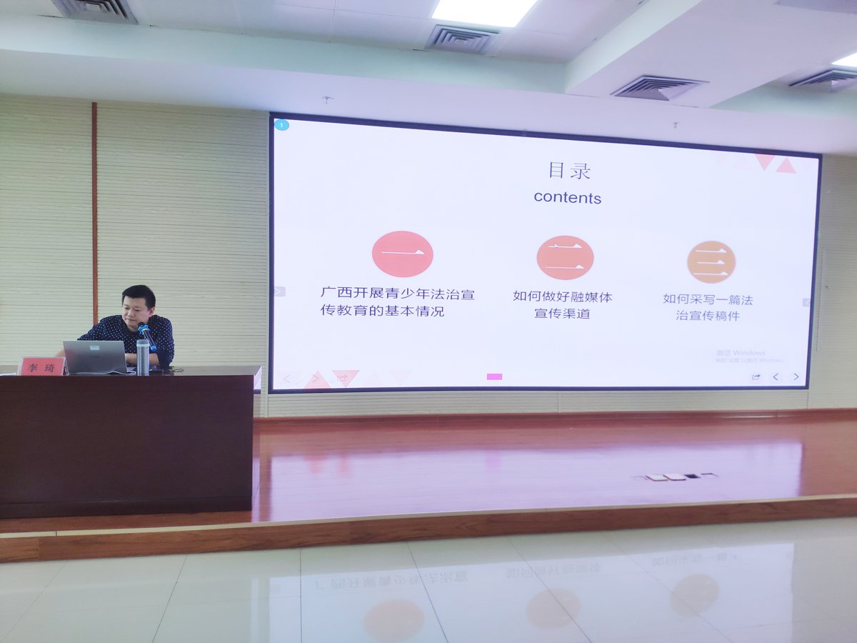 此外,本次培训还邀请到了自治区党委政法委、自治区司法厅、自治区禁毒办相关处室的负责人,围绕“平安建设考评工作”“法治宣传教育工作开展”“全区禁毒工作”作专题讲座。共青团南宁市委、共青团柳州市委分别就政府购买服务设计项目及实施、未成年人检察社会支持体系建设工作进行经验介绍。