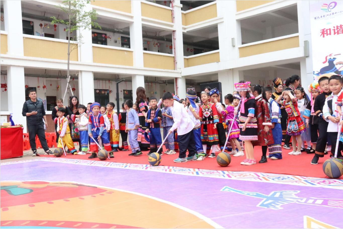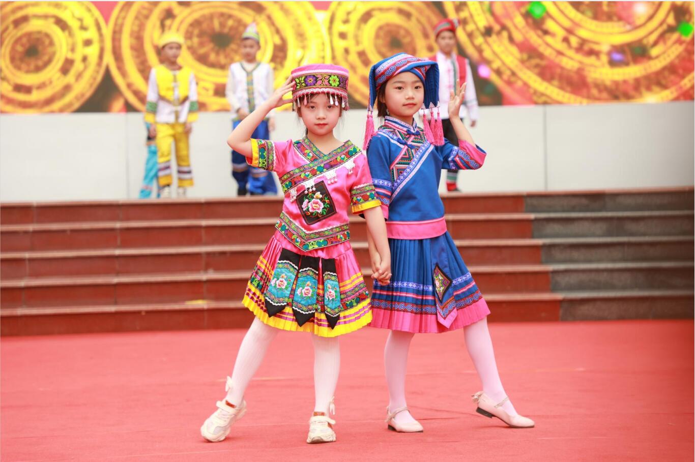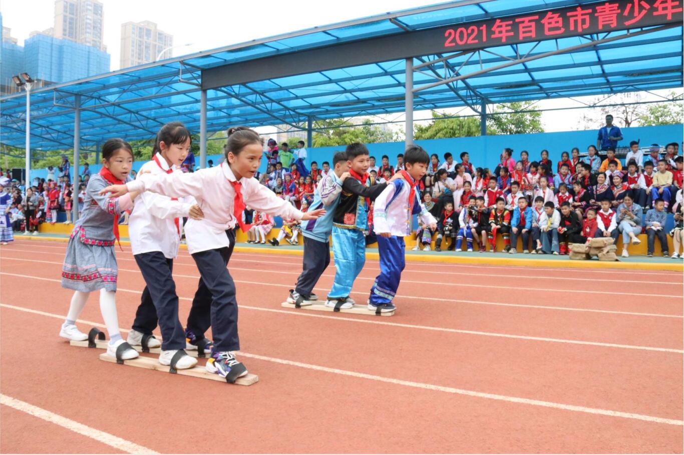 民族节目展示环节,少先队员们唱山歌、跳竹竿舞,跟随着竹竿的节奏舞动,嘉宾和老师们也纷纷参与其中,现场气氛十分热烈。此外,少先队员身着各式各样的民族服饰,带来了一场别具特色的服饰展示盛宴,展现了别样的民族风情。全体师生齐唱《国家》,嘹亮的歌声展现了广大青少年坚定不移的爱国信念和对中国共产党的真挚情感。随后的壮家民族体育会上,赶小猪、抛绣球、运送炸药包、板鞋接力等丰富多彩的民族体育项目进一步增进了现场的活跃气氛。