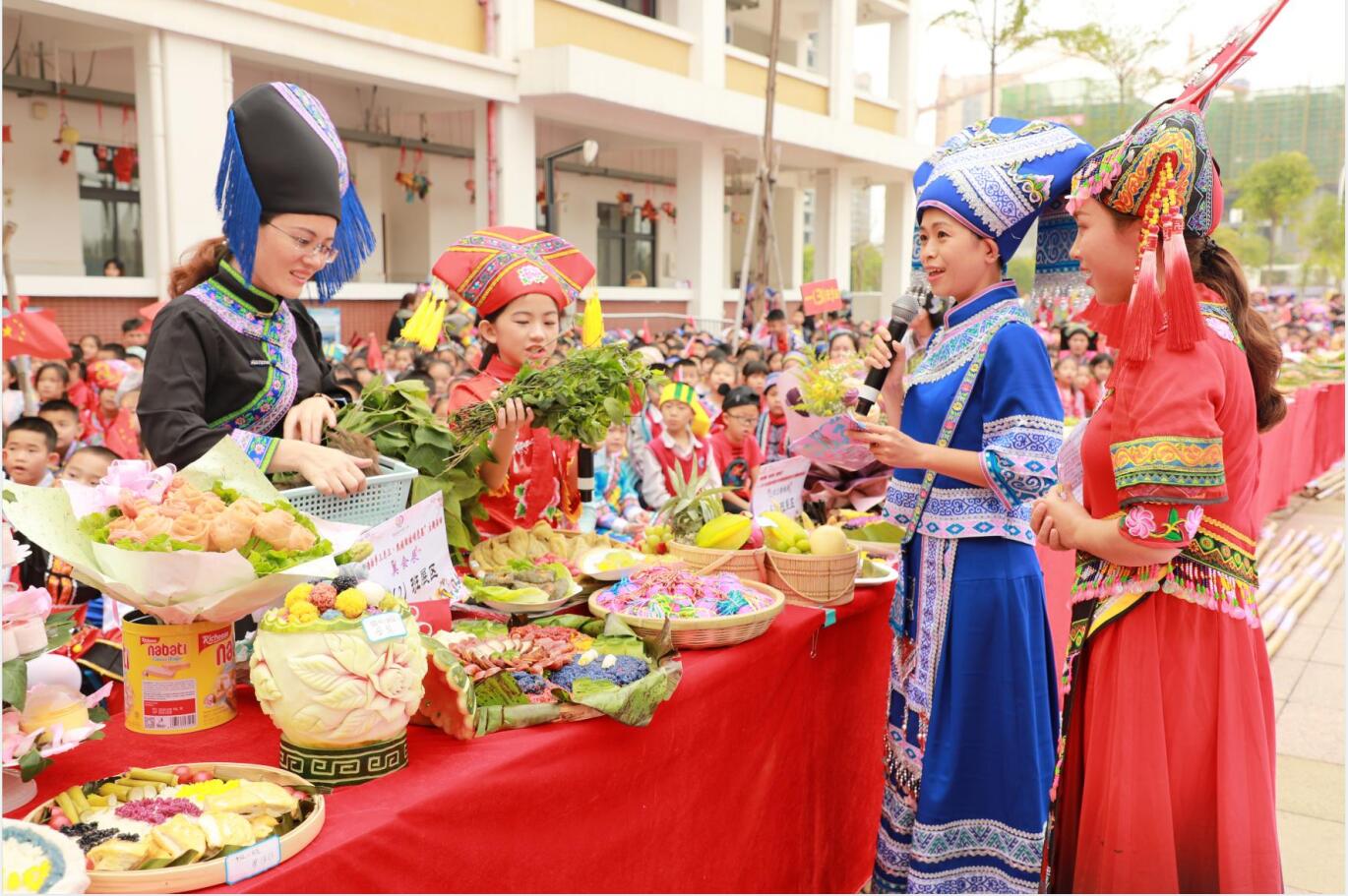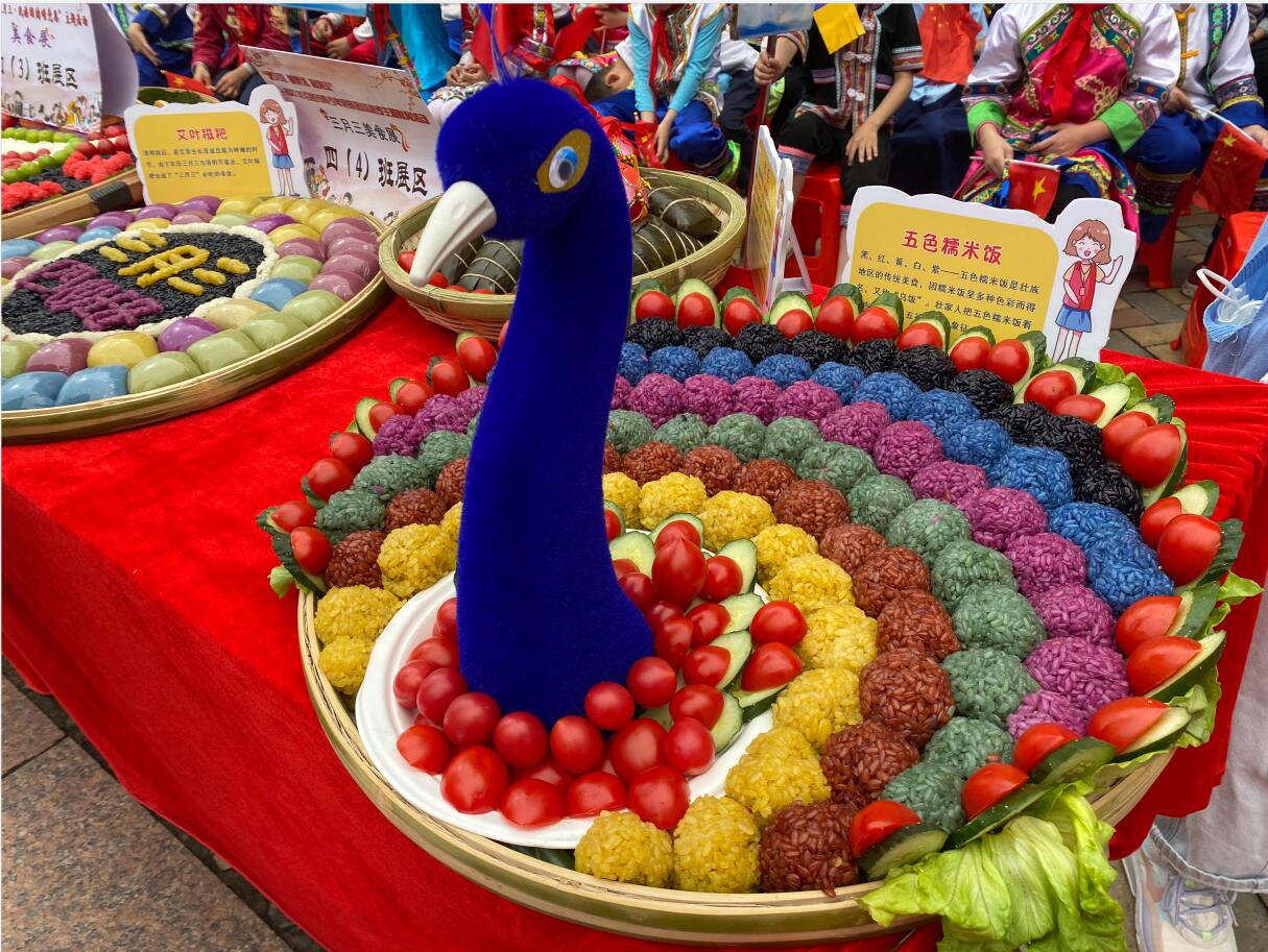 活动设置壮乡美食展示活动,现场展示五色糯米饭、艾馍、麽乜,以及图案精美、类型丰富的美食大拼盘,展现了鲜明的民族特色。家长和少先队员带来的美食小课堂,也让更多的青少年进一步了解壮乡民族文化。