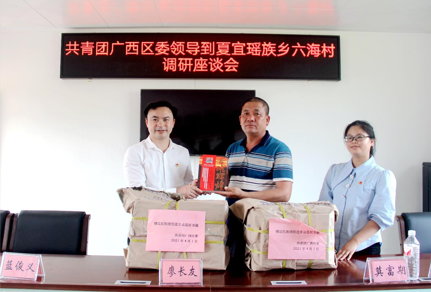 调研组一行先后到六海村民俗记忆馆、六海村文化展馆、夏宜村六寨组开展民族团结进步创建和乡村振兴调研工作。在座谈会上,双方就民族团结进步创建工作进行了深入的交流,共同商讨六海村民族团结进步创建工作和乡村振兴下一步工作计划,并统一了意见。同时就农村青年如何在乡村振兴贡献青春力量和六海村青年做了充分交流。团区委副书记、广西青联主席廖长友还为青联委员、六海村团员青年讲了一堂生动的党史课。会后,廖长友同志代表共青团广西区委向六海村捐赠了一批民族团结及党史书籍。