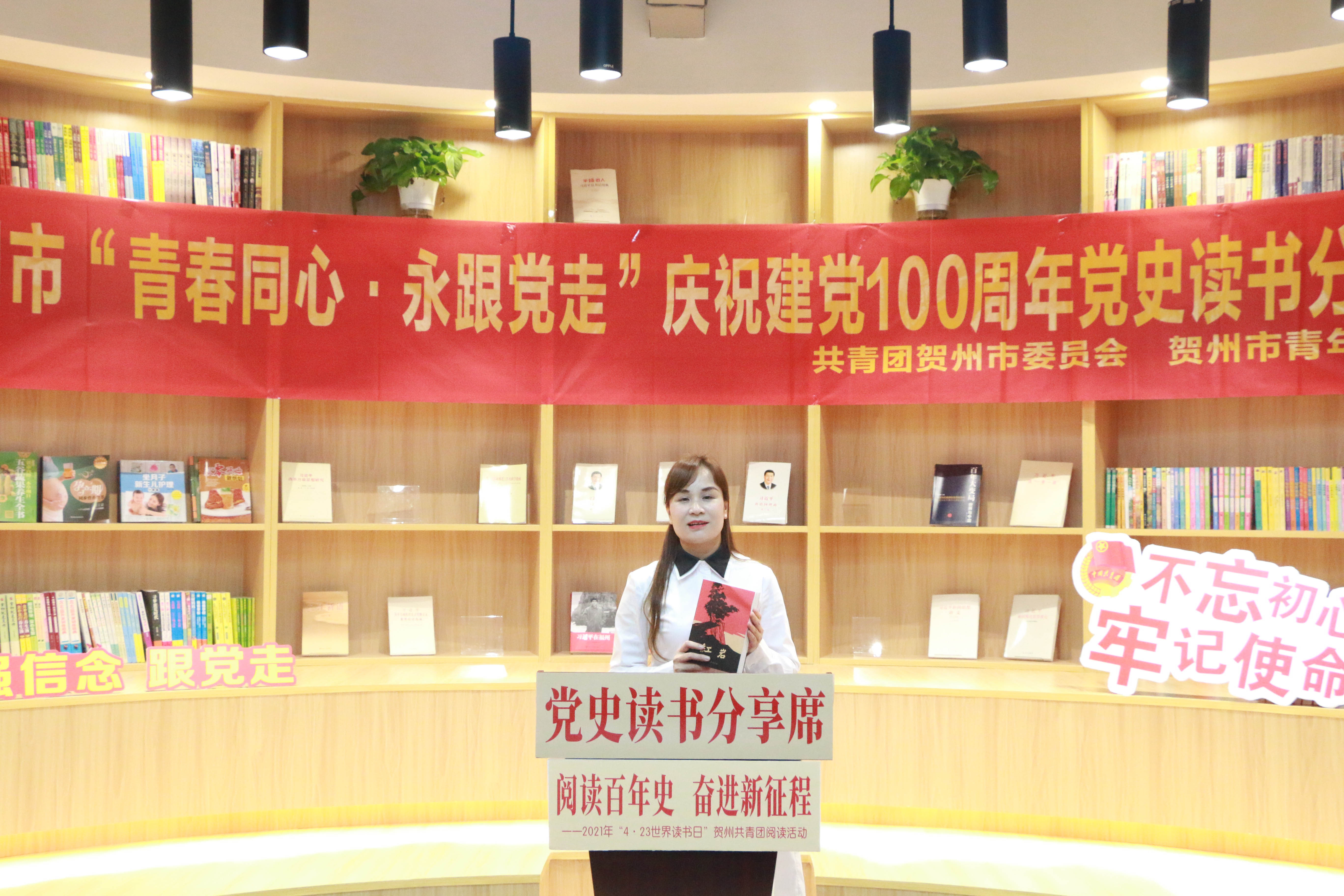 4月23日上午,共青团贺州市委员会、贺州市青年联合会结合党史学习教育工作,组织团员青年、团干部、青联委员、青少年等代表在贺州新时代文明实践中心强国书吧举行“青春同心·永跟党走”庆祝建党100周年党史读书分享会。