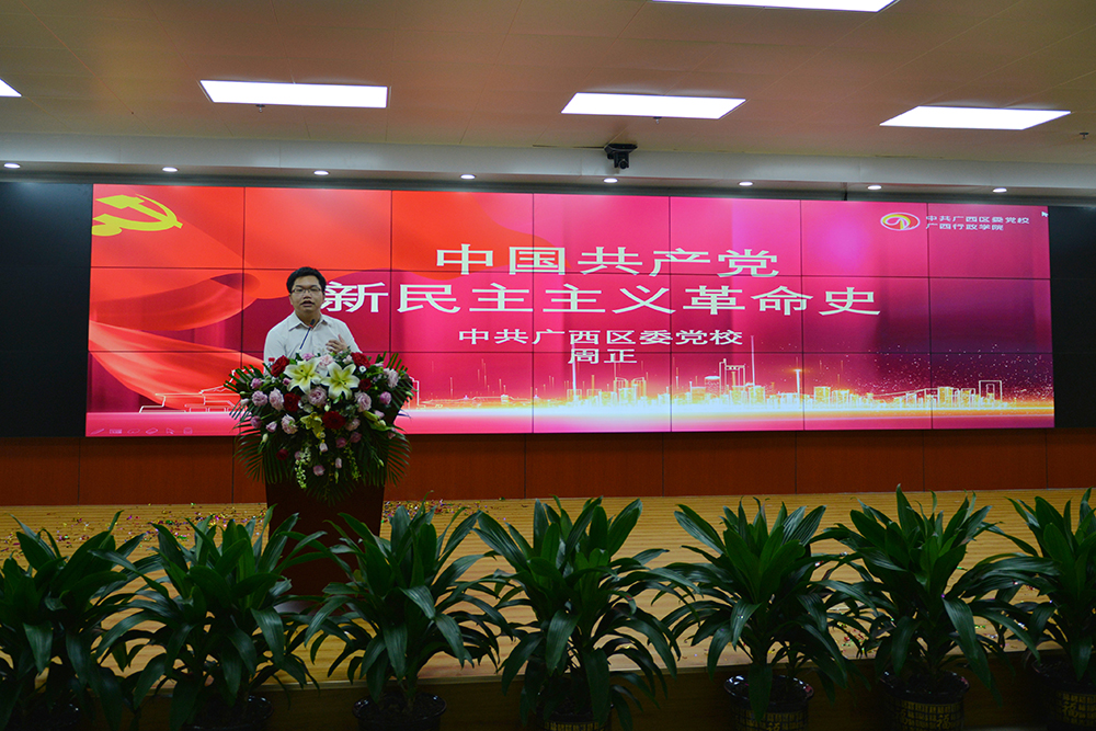 中共广西区委党校法学教研部周正讲师为团员青年们讲授“中国共产党新民主主义革命史”主题团课,引导大家知史爱党、知史爱国,使大家思想受到触动,精神得以振奋,觉悟得到提高。