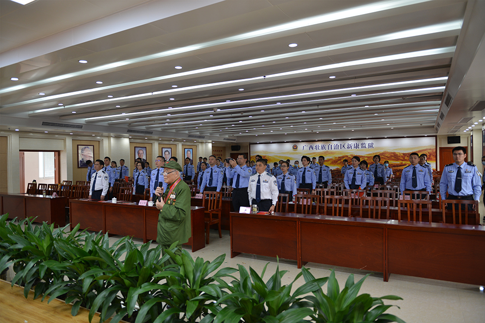 贵港监狱 甘文华:“老兵陈老讲到面对炮火连天的战场,所有先辈们当面临死亡的抉择,当面对信仰的考验,拼着誓死为了胜利的坚定信念,甘将热血沃中华。这是怀对人民赤子之心的坚定初心。这是我们要现在也要坚定的信念,传承的精神。”