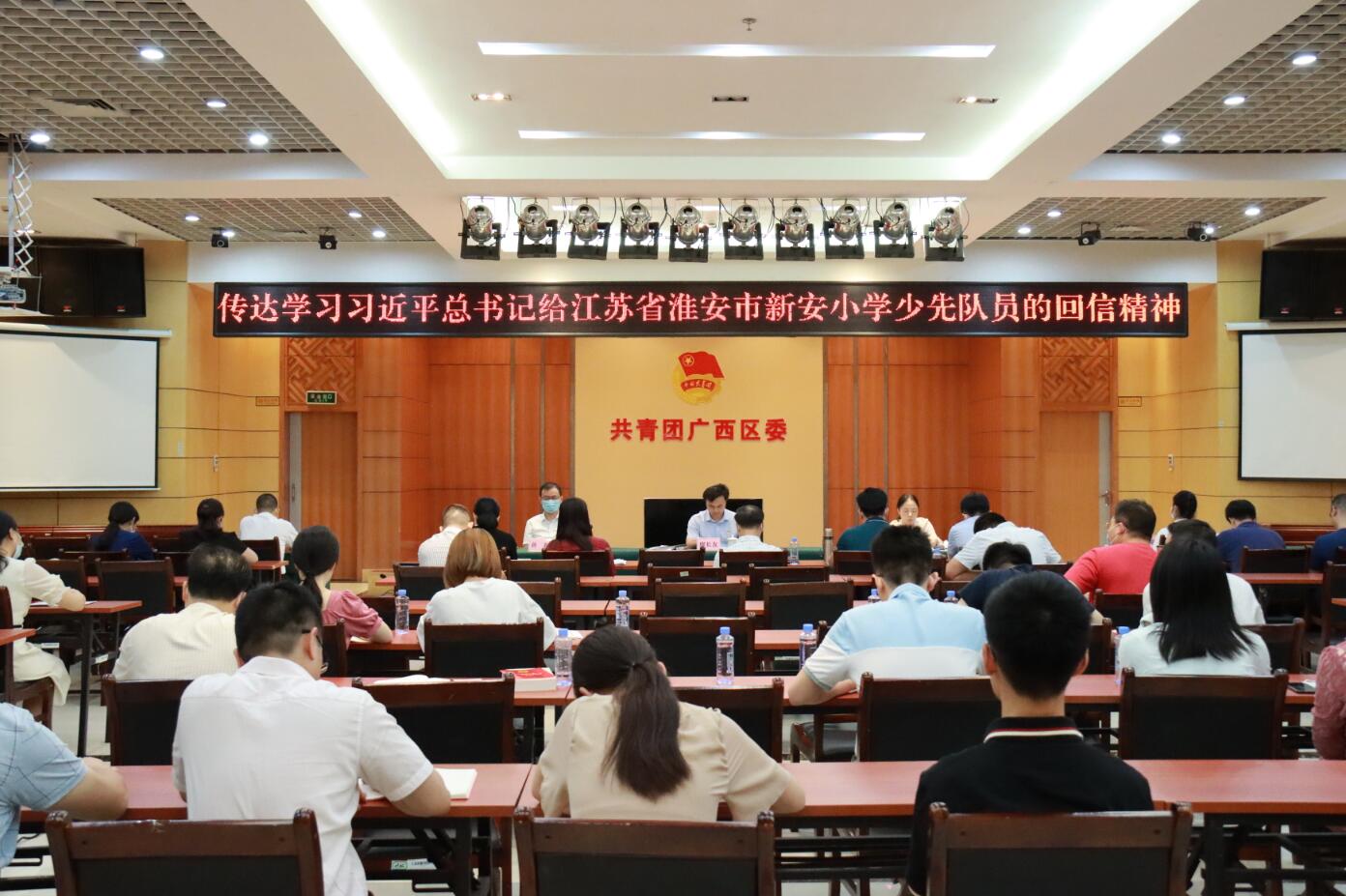 6月2日上午,共青团广西区委召开会议,传达学习习近平总书记给江苏省淮安市新安小学五(8)中队少先队员的回信精神以及团中央书记处(扩大)会议精神。团区委书记班子全体成员、机关全体党员干部、直属单位班子成员参加了会议。