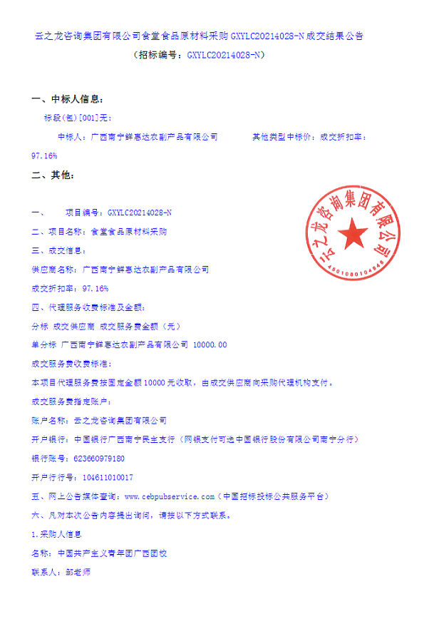 云之龙咨询集团有限公司食堂食品原材料采购GXYLC20214028-N成交结果公告
