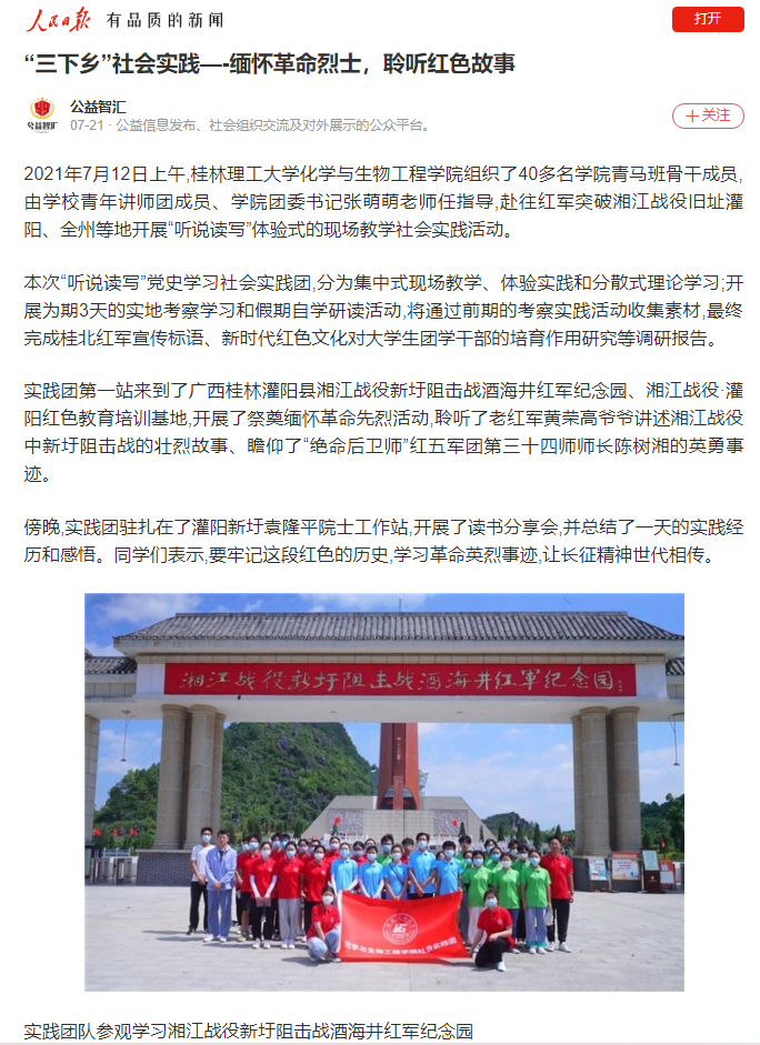 参与实践的青年学生纷纷表示,暑期社会实践活动是深入社会大课堂接受学习教育的好机会,是砥砺思想、磨练意志的良好平台,是检验所学专业理论知识的有效途径。以史为鉴、开创未来,作为桂工青年,一定会把青春奋斗融入党和人民事业,以实现中华民族伟大复兴为己任,不负时代,不负韶华。