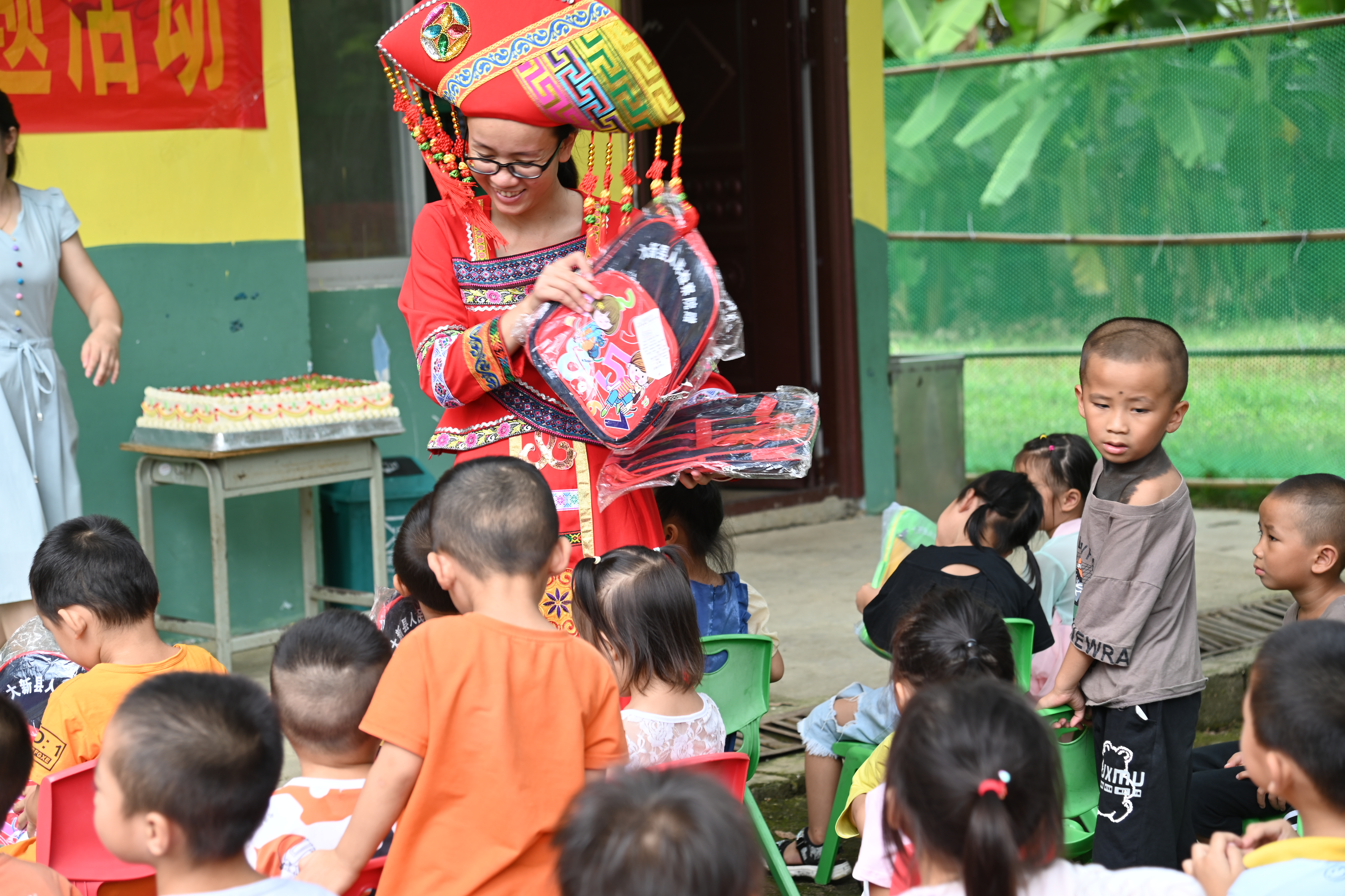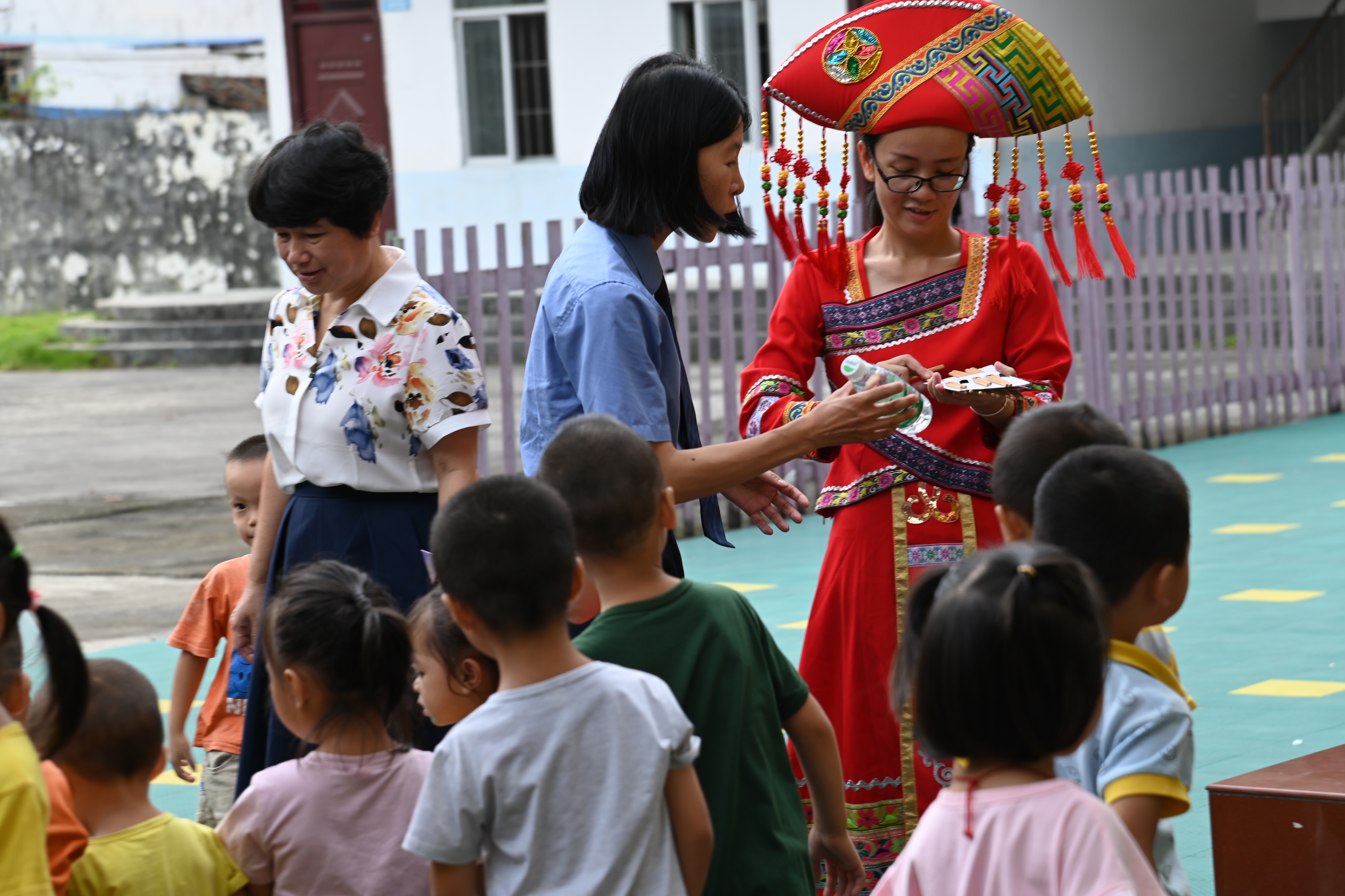 团县委书记赵娇丽穿着壮族民族服饰向孩子们介绍我县人口分布、民族结构、风俗文化等民族知识,积极引导少年儿童热爱中华民族,维护民族团结、弘扬民族精神、传播民族文化,铸牢中华民族共同体意识。