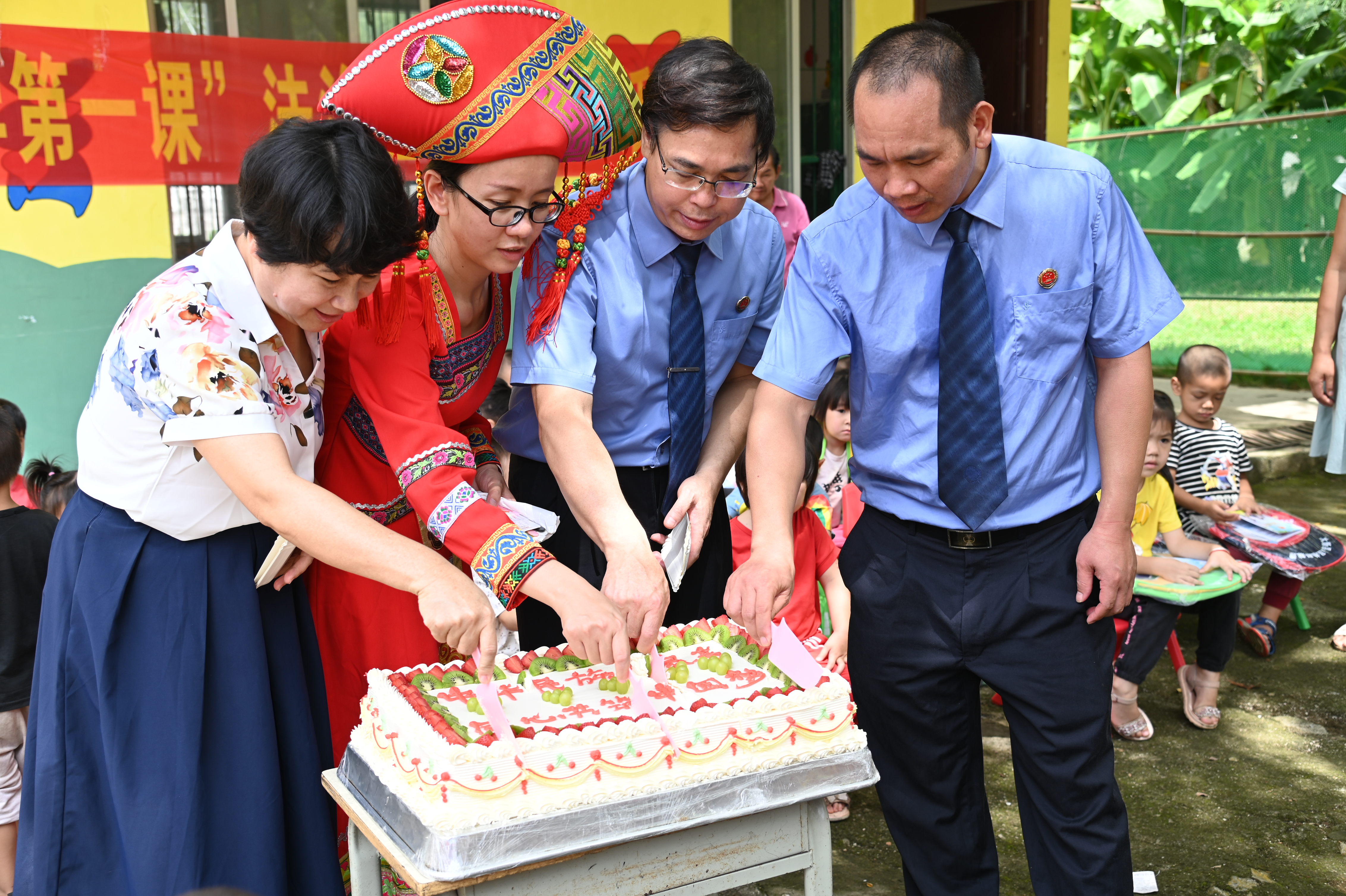 县检察院副检察长许东照、团县委书记赵娇丽、未成年人检察工作办公室主任张红成、县妇联副主席夏海连一起给少年儿童送上书包、法律宣传手册、并分享蛋糕。