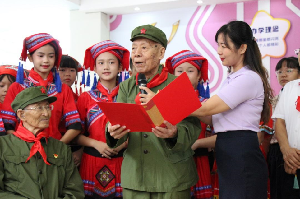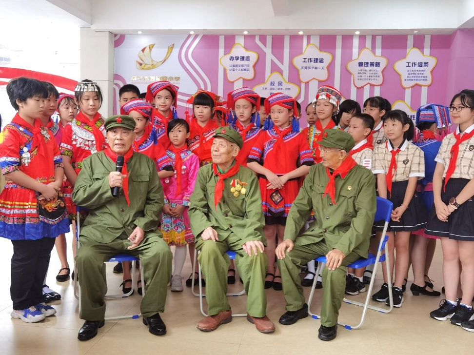 广西少先队校外辅导员、解放军老战士代表李延年爷爷、田沛霖爷爷和张树德爷爷来到活动现场与队员共庆建队日,他们勉励少先队员们好好学习,锤炼本领,强健体魄,努力成长为德智体美劳全面发展的八桂好儿童、好少年。张树德爷爷把象征革命力量的火炬传递给共青团员代表,再传递给少先队员,象征革命火种生生不息,红色基因代代相传。