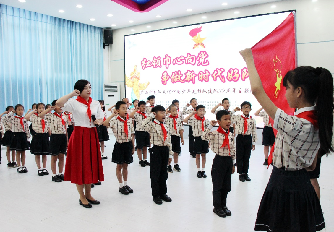 为庆祝中国少年先锋队建队72周年,2021年10月9日上午,共青团广西区委、自治区教育厅、自治区民宗委、广西少工委联合举办的“红领巾心向党 争做新时代好队员”——广西少先队庆祝中国少年先锋队建队72周年主题队日活动在南宁市园湖路小学隆重举行,2300多名师生共同参加了活动。通过举行少先队入队仪式,颁发“红领巾奖章”,聆听革命前辈的深情寄语,以及广西、西藏、新疆三地少先队员的线上互动和线下交流,不断丰富“十·一三”这一特殊节日的教育内涵,引导广大少先队高举旗帜跟党走,增强少先队员的光荣感和组织归属感,为广大少先队员争做新时代好队员起到了积极的促进和推动作用。