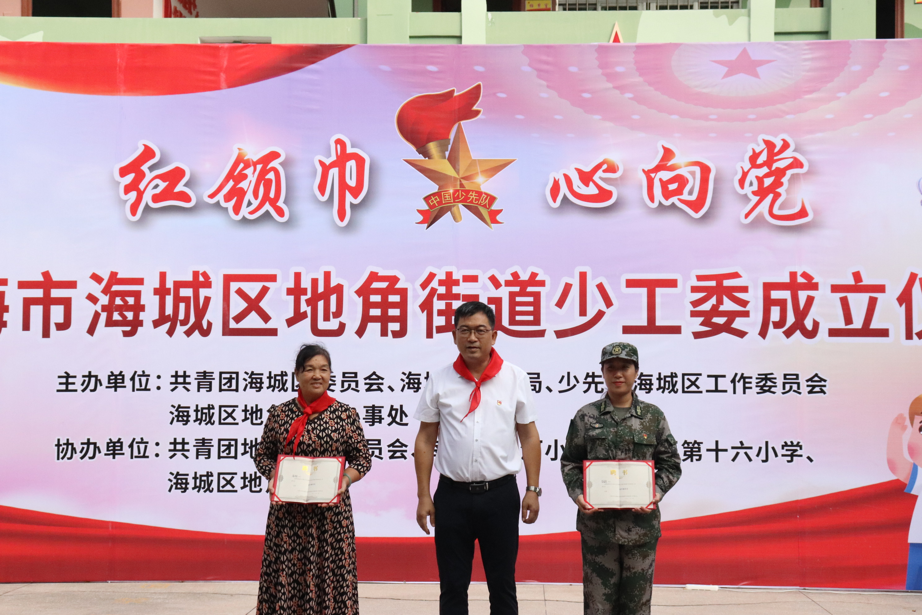 程霞、许承才以及海城区地角街道党工委、团区委负责人共同为海城区地角街道少工委揭牌。向北海市海城区海防战备执行连连长、北海市道德模范代表等颁发了校外辅导员聘书。党、团代表依次向少先队员传递象征红色基因的红缨枪。