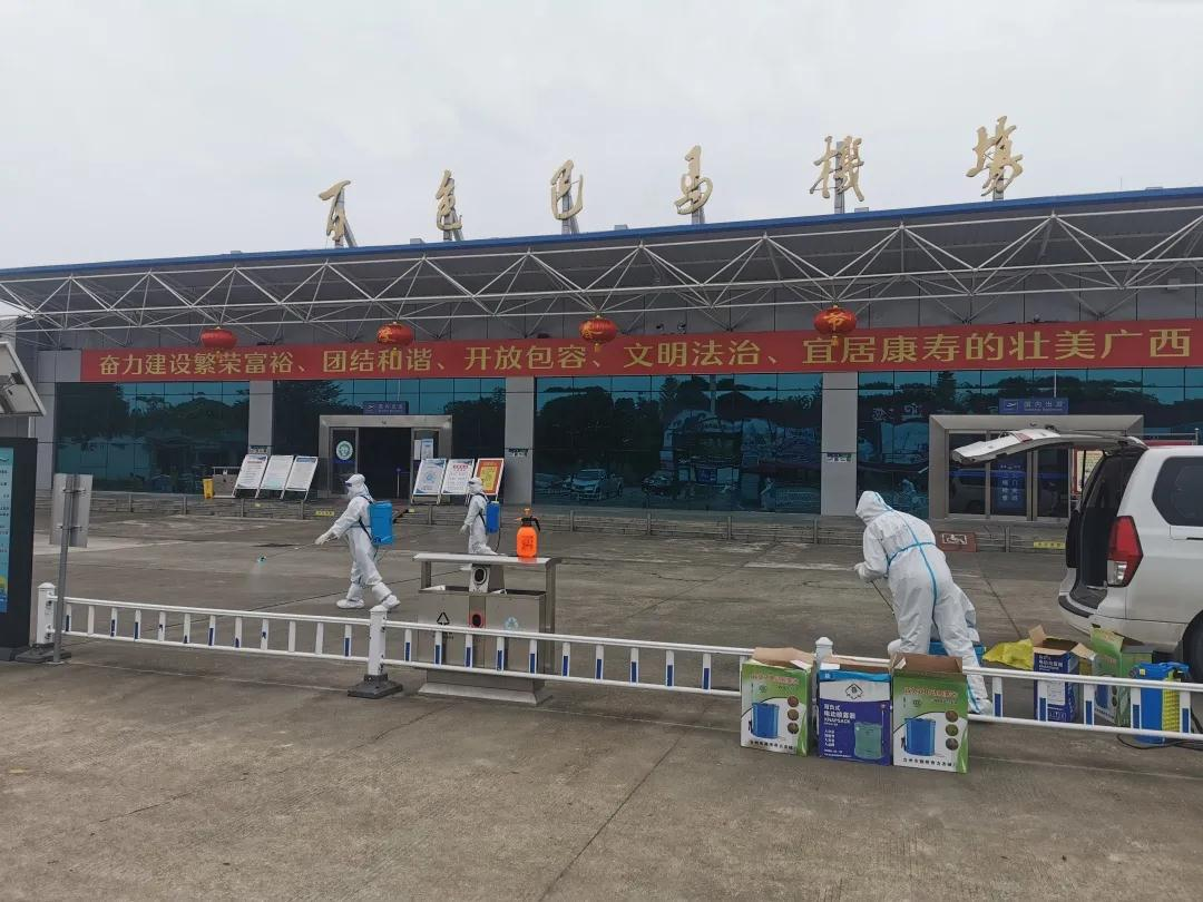 百色机场青年志愿者在航站楼内部进行消杀工作