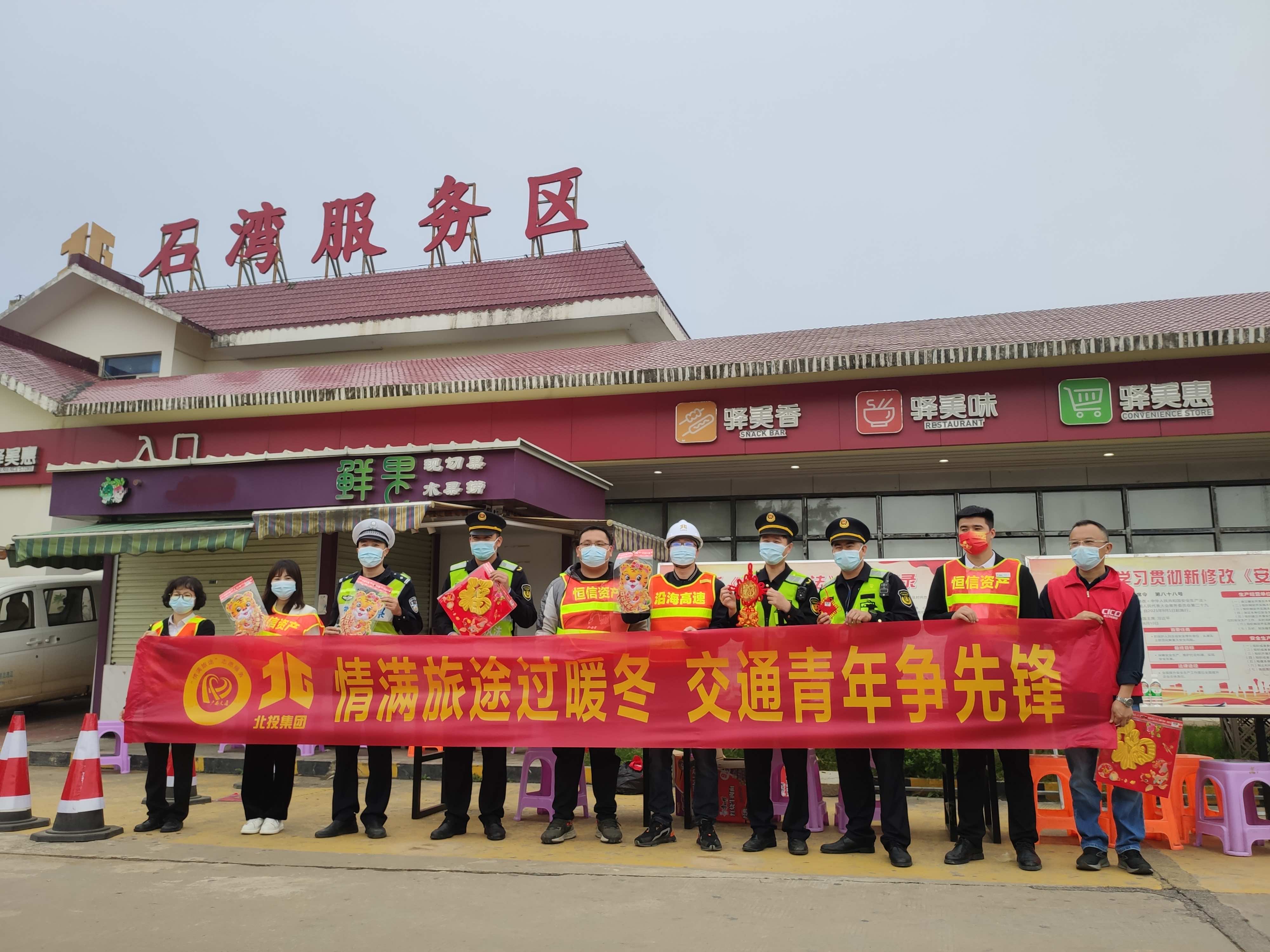 1-2月,自治区交通运输综合行政执法局第九支队第四大队联合广西交警总队高速公路管理九大队,广西沿海高速公路分公司北海运营管理中心、广西北部湾恒信资产经营有限公司等部门在石湾服务区开展“情满旅途”志愿服务活动,用爱心为旅客打造一条舒适、温馨的回家之路。活动现场,交通青年志愿服务者在设置的服务站点前为过往乘客派发疫情防控宣传手册、道路交通安全手册、道路法律法规宣传册,为司乘提供路线咨询、安全行车向导、法律法规咨询等服务。交通青年们以积极、热情的服务态度为广大司乘人员营造出向上向善、温馨和谐、服务为民的交通文明新风氛围。
