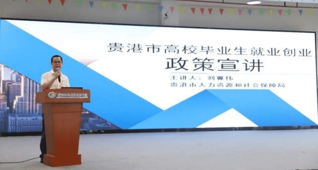 市人力资源和社会保障局副局长刘翼伟、团市委青年发展部长韦相宇分别向师生们宣讲了高校毕业生就业创业和职业培训等相关政策及贵港市青年创业就业优惠政策,全方面解读了毕业生在广西就业期间享受的扶持补贴、社会保险、求职创业等各项补贴政策,同时对青年创业信用贷款、大学生乡村创业等内容做了详细的介绍,为同学们后续的就业创业提供了资金支持和政策保障。