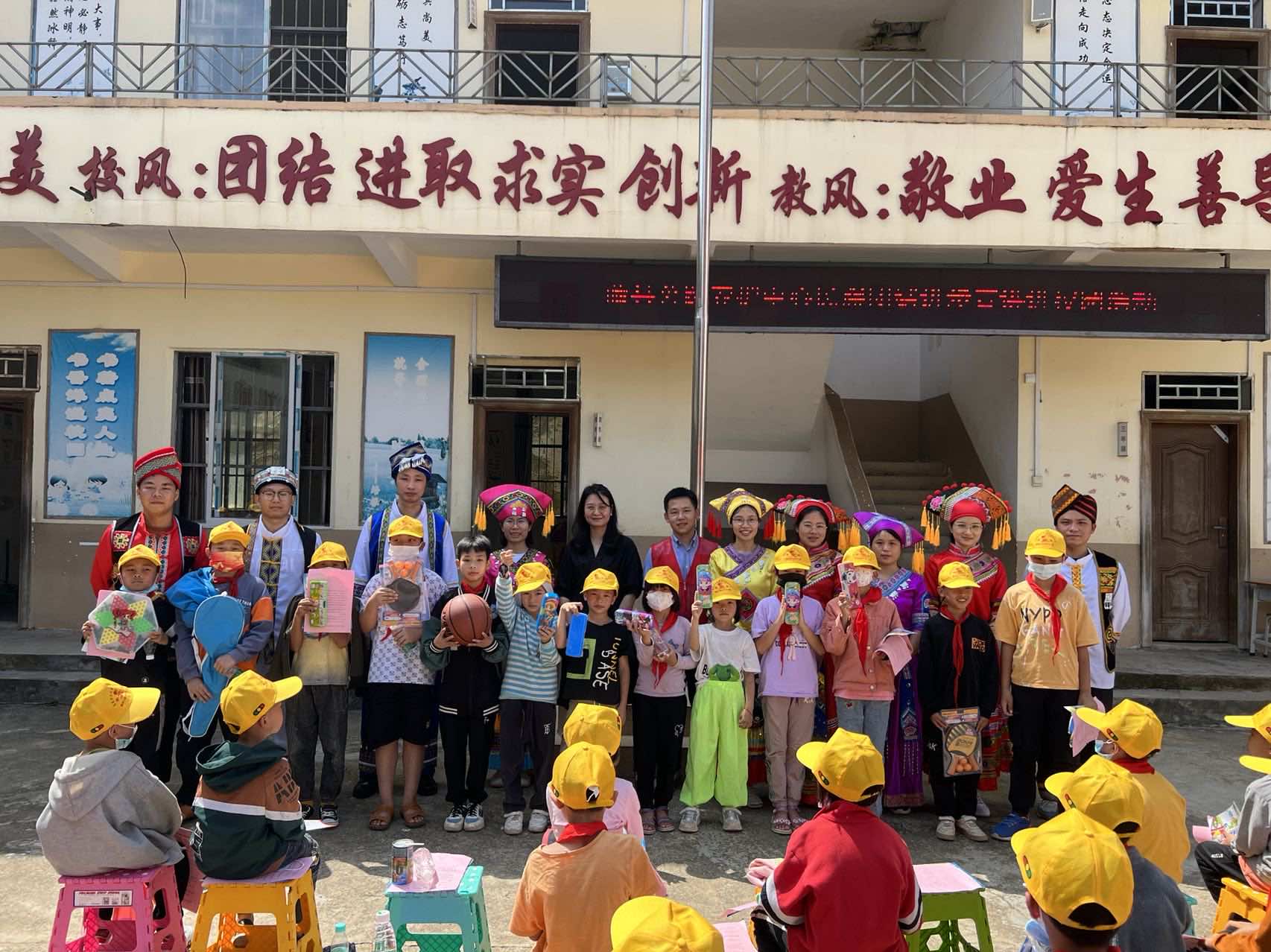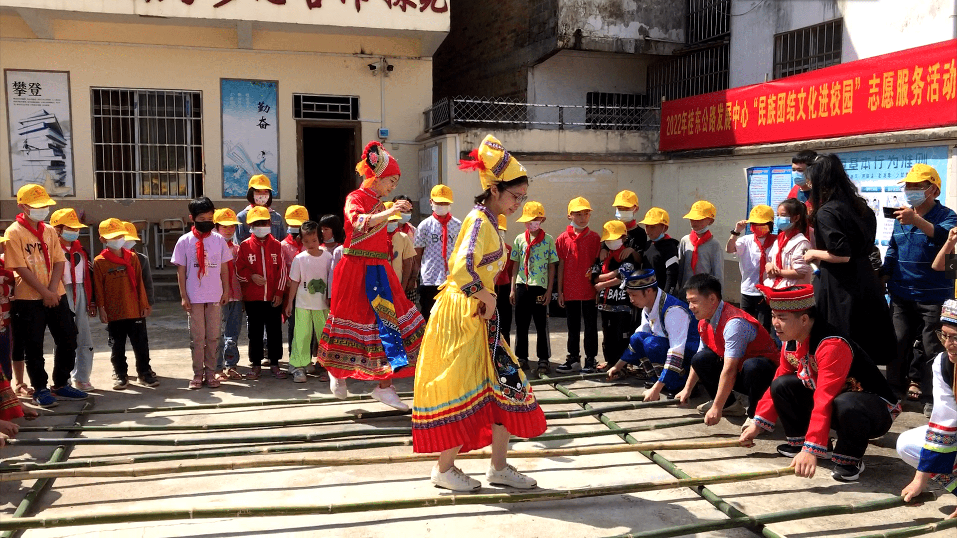 在莫埌小学的操场上,身着民族服装的青年们给小学生们开展民族团结教育课程、安全文明交通课程、民族竹竿舞以及发放交通安全“小黄帽”等多个活动,通过简短的课程及活动,让学生们在欢快的氛围中学习到民族团结、交通安全的相关知识,随后的知识问答竞赛中,学生们更是争相抢答,现场可谓热闹非凡。