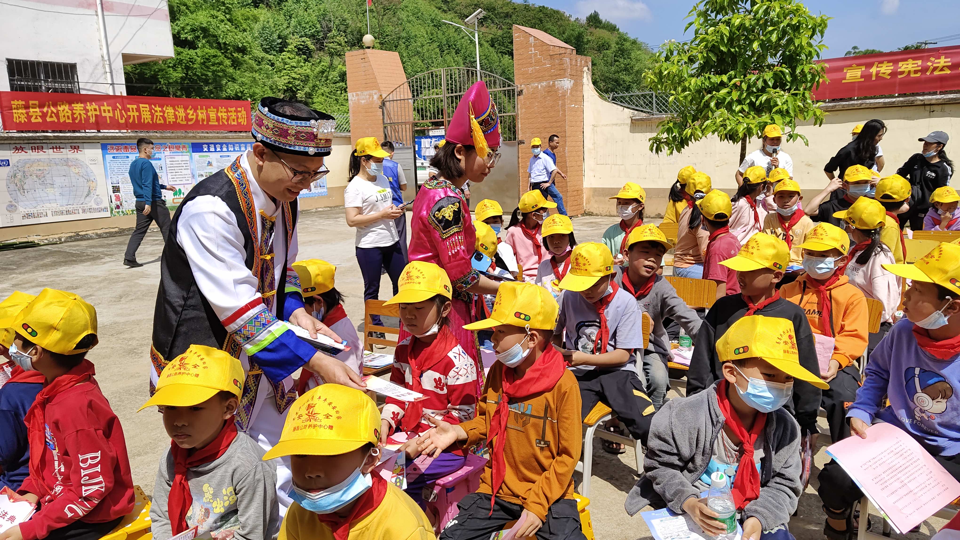 5月17日,藤县公路养护中心党团联合组织中心青年职工身着民族服装,带着民族团结的春风,走进藤县埌南镇莫埌小学的校门,为莫埌小学的学生们开展了一场极具民族特色的民族团结宣传活动。