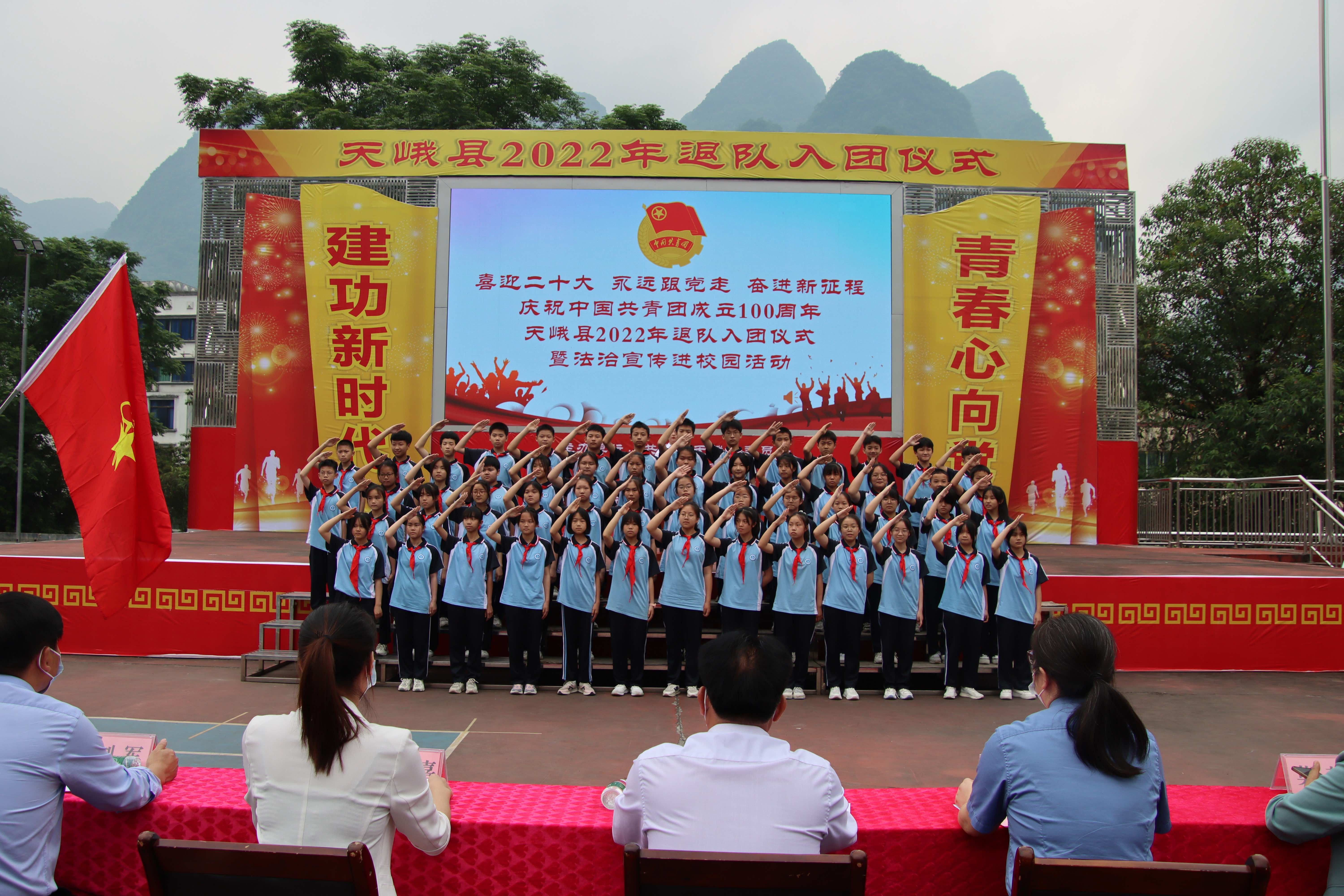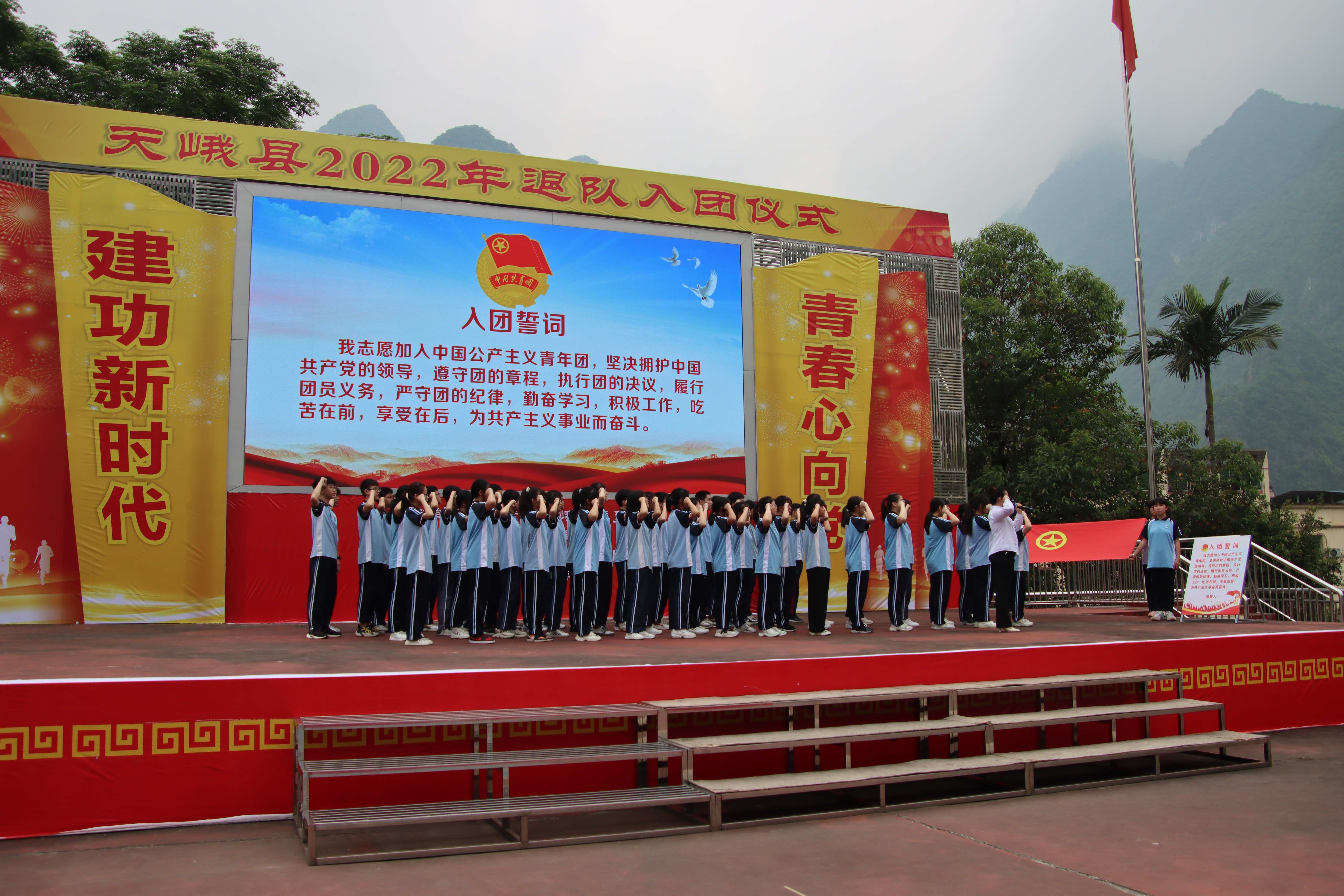 在庆祝中国共青团成立100周年之际,为迎接党的二十大胜利召开,团结引领广大青少年坚定跟党走、建功新时代,进一步加强新时期青少年的团员意识教育,增强党团组织的凝聚力和号召力,5月19日,天峨县在天峨县中学举行“喜迎二十大 永远跟党走 奋进新征程”退队入团仪式集中示范活动。