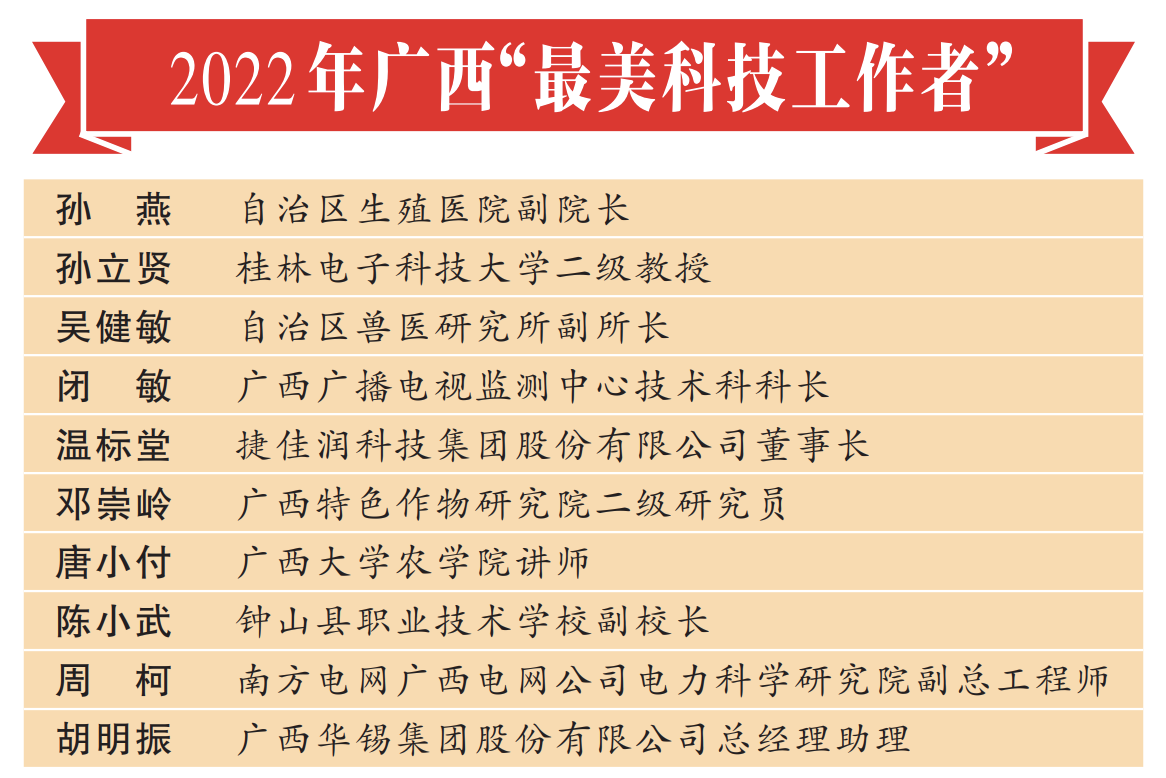 为了进一步弘扬科学家精神,激发广大科技工作者的荣誉感、自豪感、责任感,日前,自治区党委宣传部、科协、科技厅、工信厅、广西科学院、广西农科院六部门开展“最美科技工作者”选树宣传活动,并评选出10名2022年广西“最美科技工作者”。
