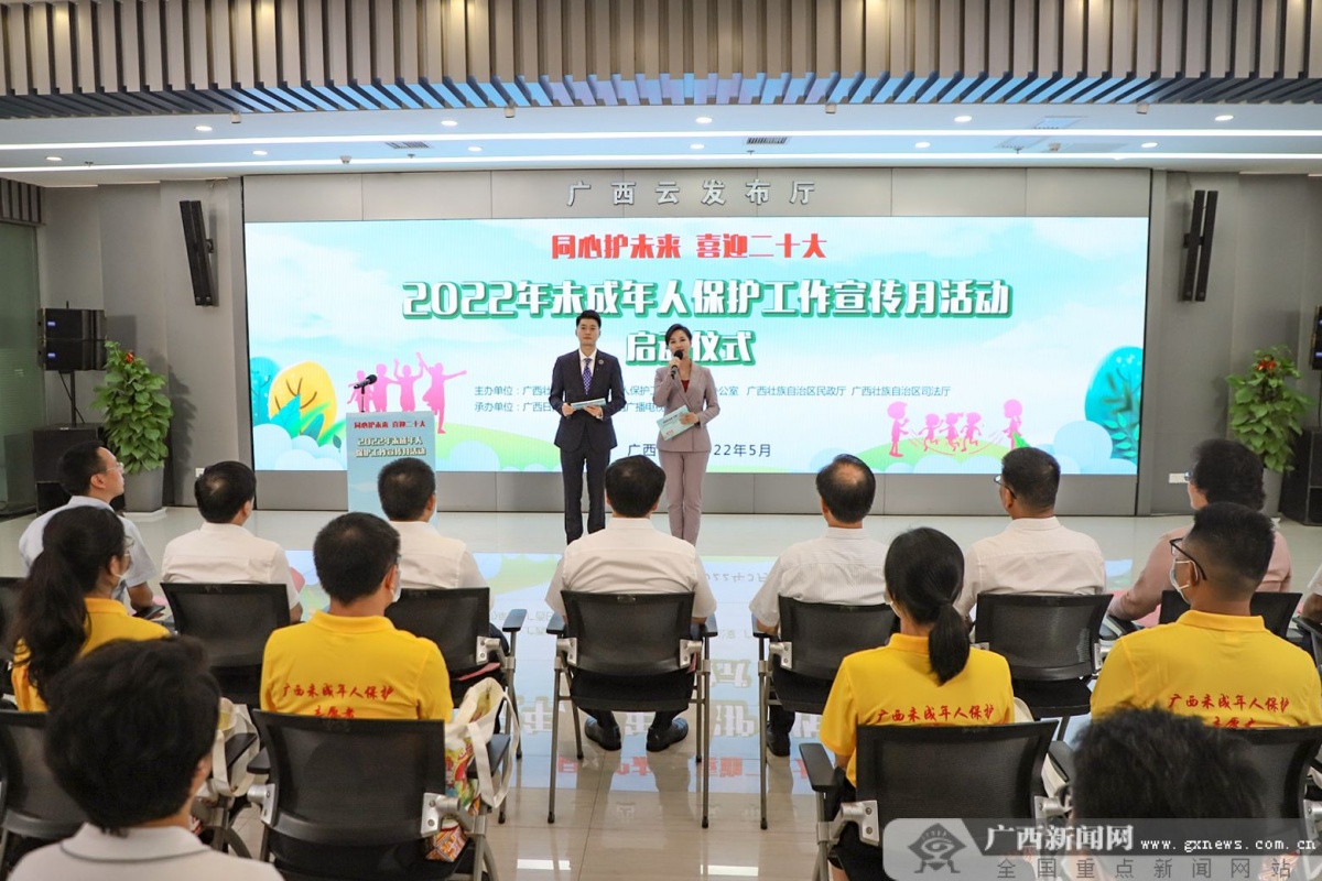 5月31日,在“六一”国际儿童节来临之际,由自治区未成年人保护工作领导小组办公室、自治区民政厅、自治区司法厅主办,广西日报传媒集团、广西广播电视台承办的“同心护未来 喜迎二十大”——2022未成年人保护工作宣传月活动在广西云新闻发布厅正式启动。