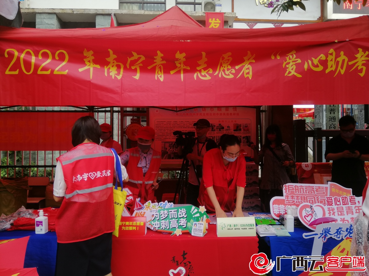 民生银行南宁分行在南宁市第四中学民主校区考点设立爱心助考点,免费向考生提供雨伞、水、文具、应急药品等。刘琴 摄