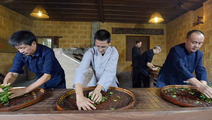刘国英(中)在展示茶叶手工揉捻技艺。王震潭摄