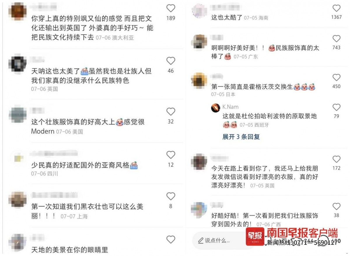 典礼结束后,李女士在学校拍照留念。这些图片上传至国内一个知名社交网站后,有一万多人为她点赞。还有很多来自国内外IP的评论:“这也太酷了”“第一次看到把我们壮族传统服饰穿到国外去的”“最酷的毕业服”“感谢弘扬壮族服饰”……