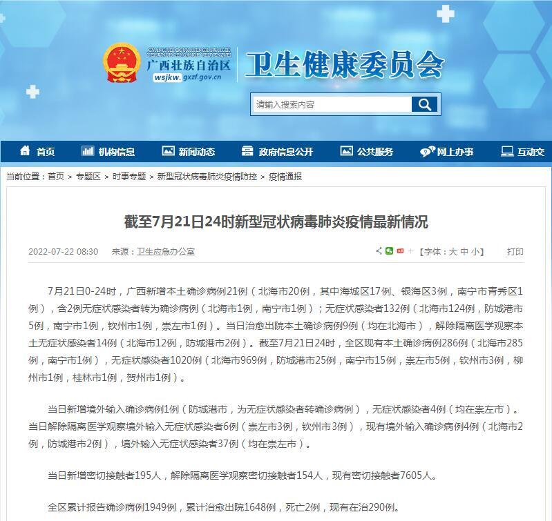 7月21日0-24时,广西新增本土确诊病例21例(北海市20例,其中海城区17例、银海区3例,南宁市青秀区1例),含2例无症状感染者转为确诊病例(北海市1例,南宁市1例);无症状感染者132例(北海市124例,防城港市5例,南宁市1例,钦州市1例,崇左市1例)。当日治愈出院本土确诊病例9例(均在北海市),解除隔离医学观察本土无症状感染者14例(北海市12例,防城港市2例)。截至7月21日24时,全区现有本土确诊病例286例(北海市285例,南宁市1例),无症状感染者1020例(北海市969例,防城港市25例,南宁市15例,崇左市5例,钦州市3例,柳州市1例,桂林市1例,贺州市1例)。