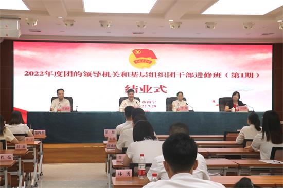 7月29日上午,中央团校2022年度团的领导机关和基层组织团干部进修班(第1期)在广西团校举行结业式,来自广西、福建、海南的63名学员圆满完成了为期一个月的培训学习。