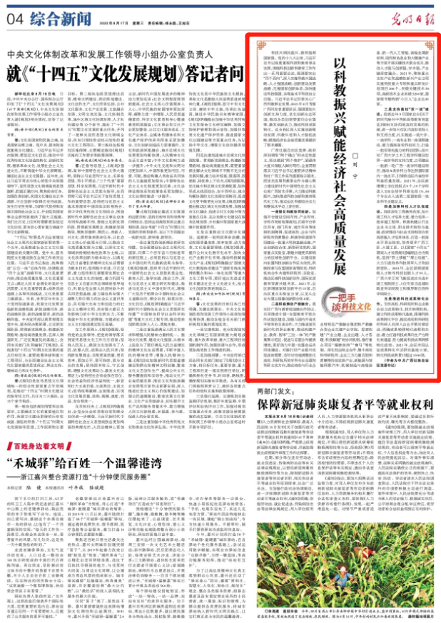 8月17日,光明日报4版刊发自治区党委书记刘宁署名文章《【一把手谈科技文化】以科教振兴赋能经济社会高质量发展》