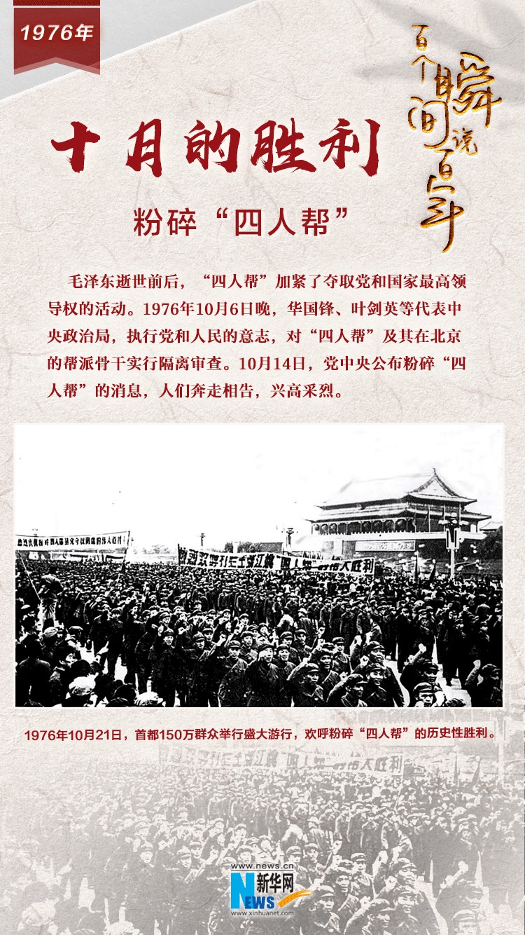 1976年,毛泽东逝世前后,“四人帮”加紧了夺取党和国家最高领导权的活动,许多老一辈革命家深感忧虑。10月6日晚,华国锋、叶剑英等代表中央政治局,执行党和人民的意志,对“四人帮”及其在北京的帮派骨干实行隔离审查。10月14日,党中央公布粉碎“四人帮”的消息,人们奔走相告,兴高采烈。