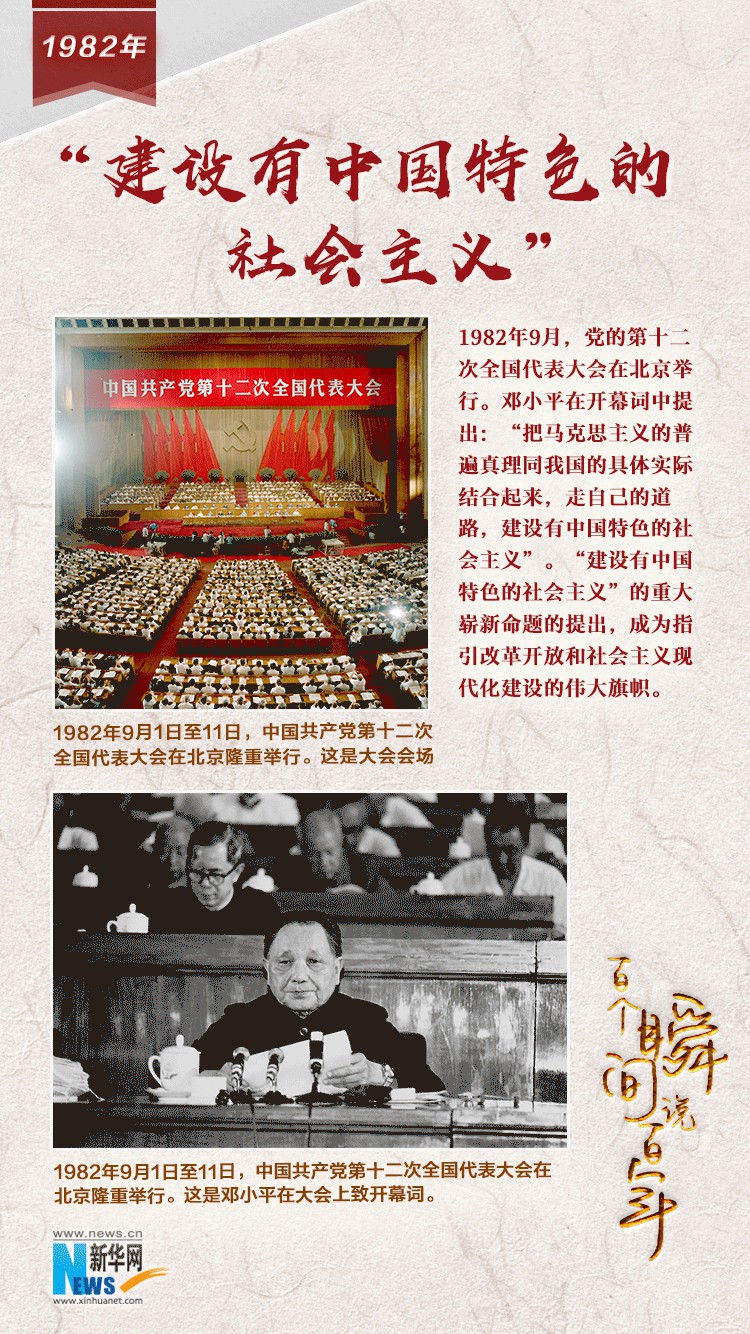 1982年9月1日至11日,党的第十二次全国代表大会在北京举行。邓小平在开幕词中响亮提出:“把马克思主义的普遍真理同我国的具体实际结合起来,走自己的道路,建设有中国特色的社会主义”。“建设有中国特色的社会主义”的重大崭新命题的提出,回答了进入改革开放新时期后走什么样的道路这一全党和全国人民最为关心的重大问题,它成为指引改革开放和社会主义现代化建设的伟大旗帜。