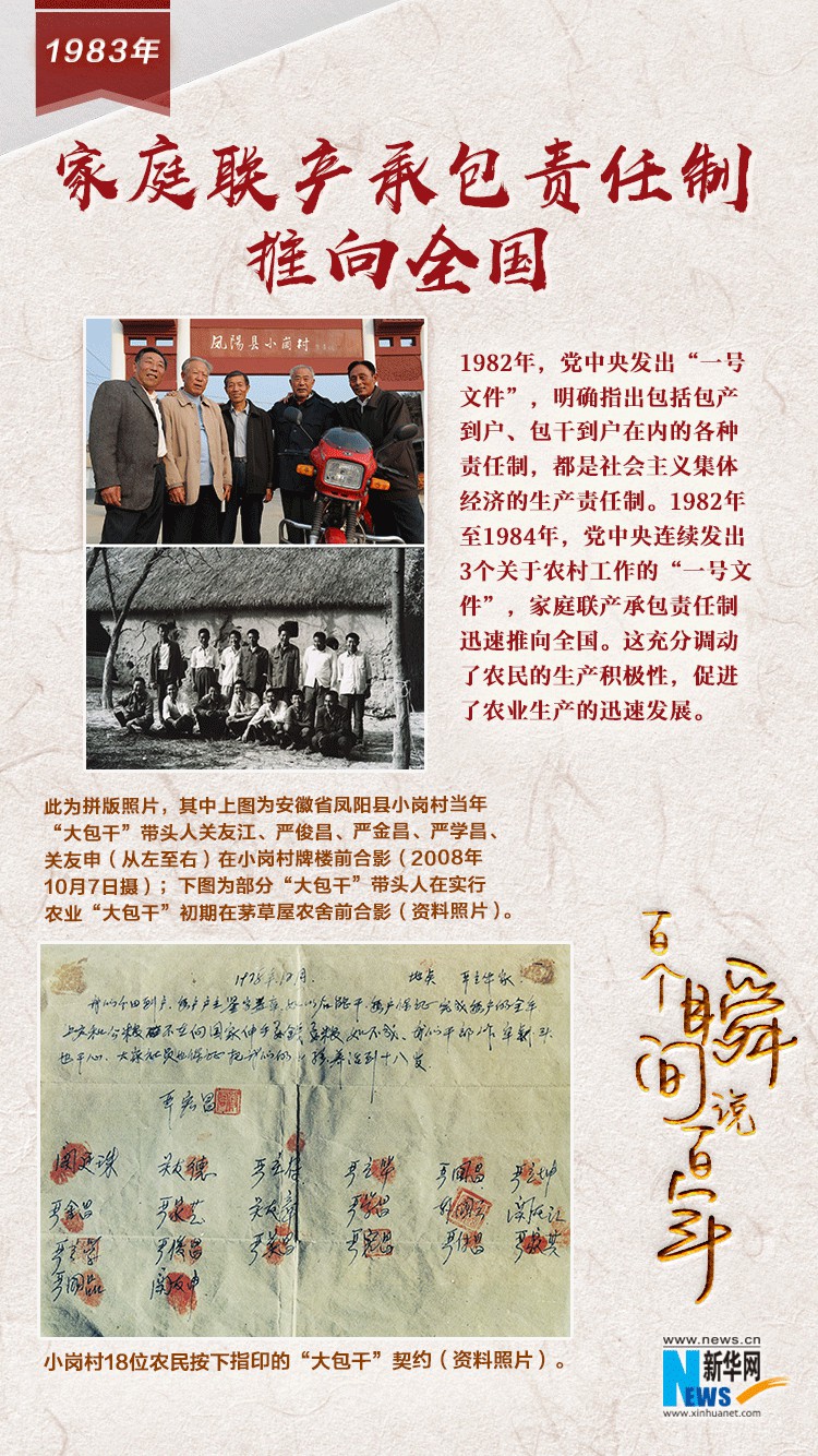 1982年至1984年,党中央连续发出3个关于农村工作的“一号文件”,家庭联产承包责任制迅速推向全国。这充分调动了农民的生产积极性,促进了农业生产的迅速发展。许多地方一年即见成效,粮食产量明显提高,几年就变了个大样。