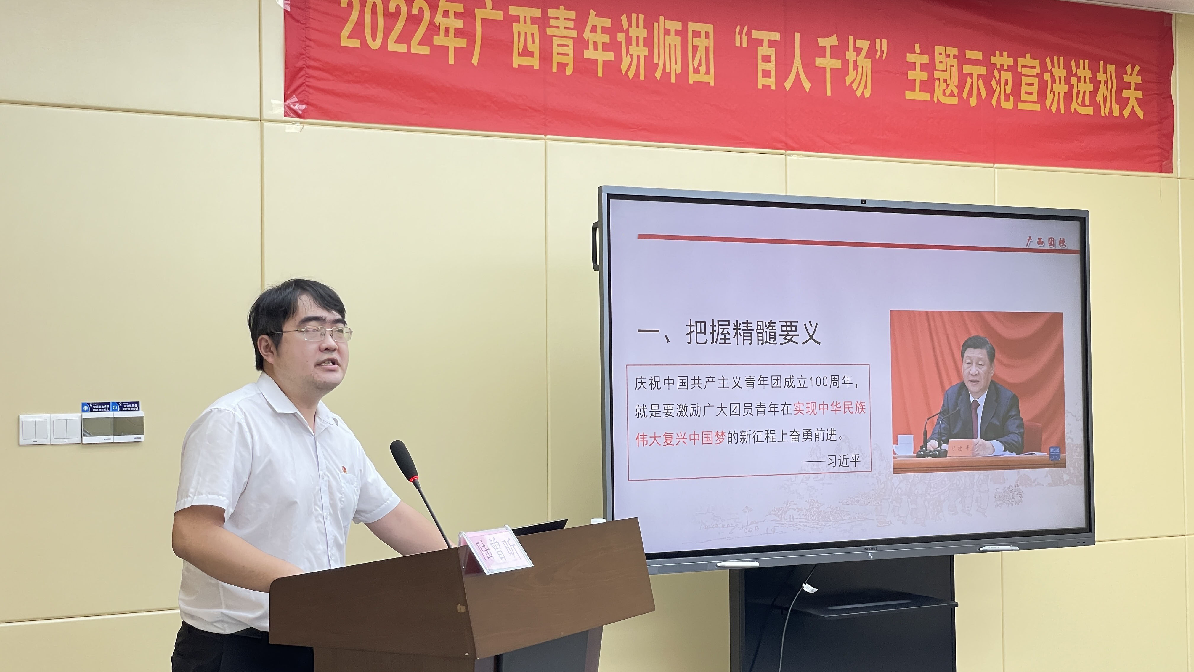 广西团校一级教师、黄文秀式好青年陆曾昕围绕“学总书记重要讲话,做新时代先锋分子”主题,在宣讲中提出广大青年要深入学习贯彻习近平总书记重要讲话精神,从共青团的百年奋斗历史经验中汲取智慧和力量,要坚定不移沿着习近平总书记指引的方向奋勇前行。