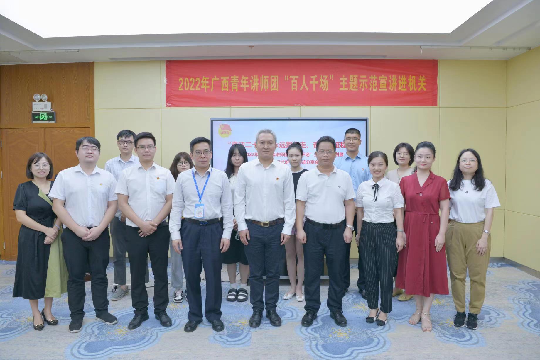 9月9日,由共青团广西区委主办,自治区直属机关团工委承办,自治区市场监管局机关团委、广西质检院团支部协办的“喜迎二十大、永远跟党走、奋进新征程”——2022年广西青年讲师团“百人千场”主题示范宣讲暨黄文秀式好青年事迹分享会在中国-东盟检验检测认证高技术服务集聚区(以下简称“集聚区”)广西质检院总部举办。团广西区直工委书记焦成举,广西质检院党委副书记、院长蒙泳出席宣讲会。广西青年讲师团成员生忠军、温丽华、陆曾昕做主题示范宣讲。自治区市场监管局基层青年代表约50人参加了本次分享会。