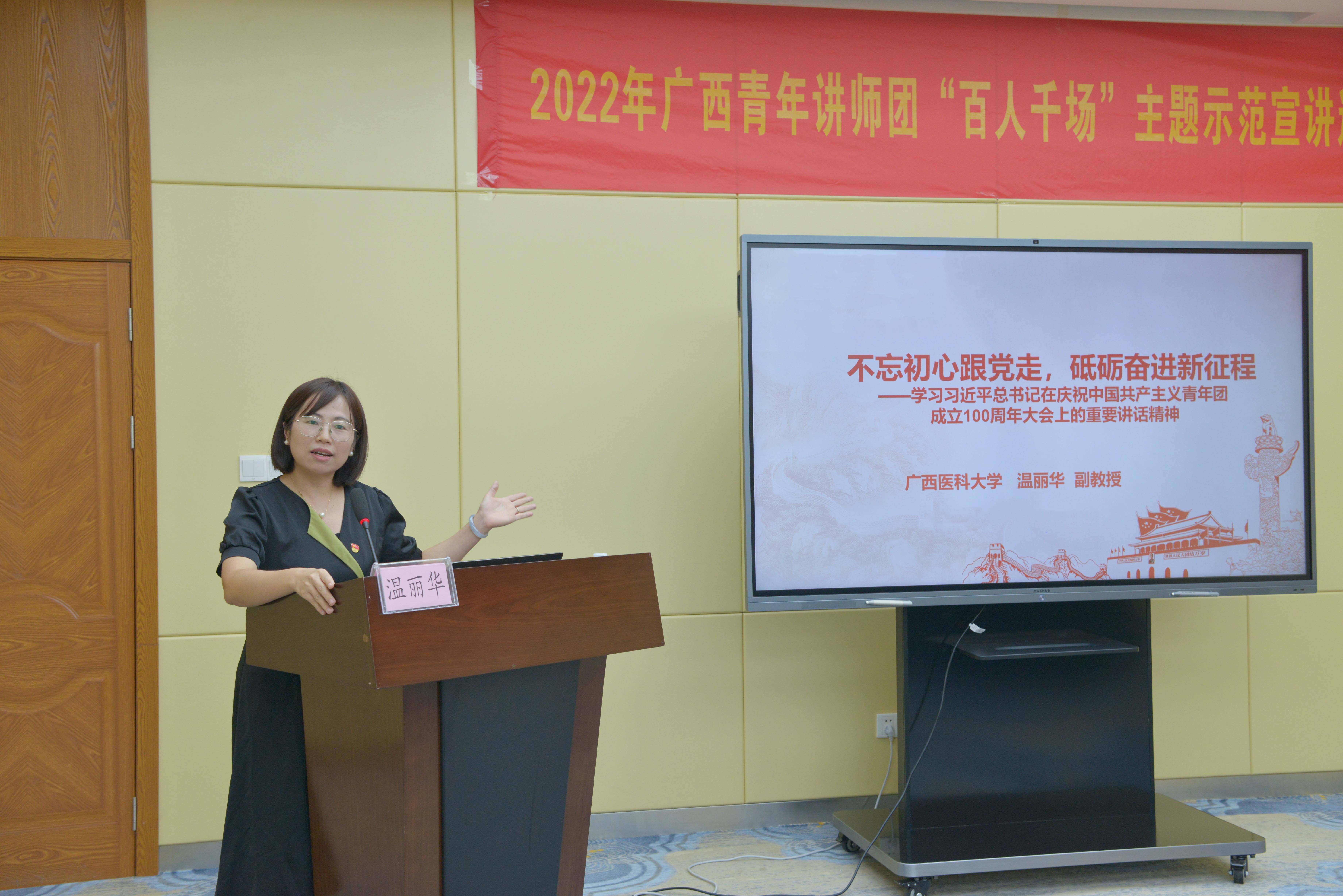 广西医科大学马克思主义学院副教授温丽华围绕“不忘初心跟党走,砥砺奋进新征程”进行主题宣讲,提出广大青年要立足实际,紧跟党的奋进步伐,勇立时代潮头,为实现中华民族伟大复兴的中国梦贡献青春力量。
