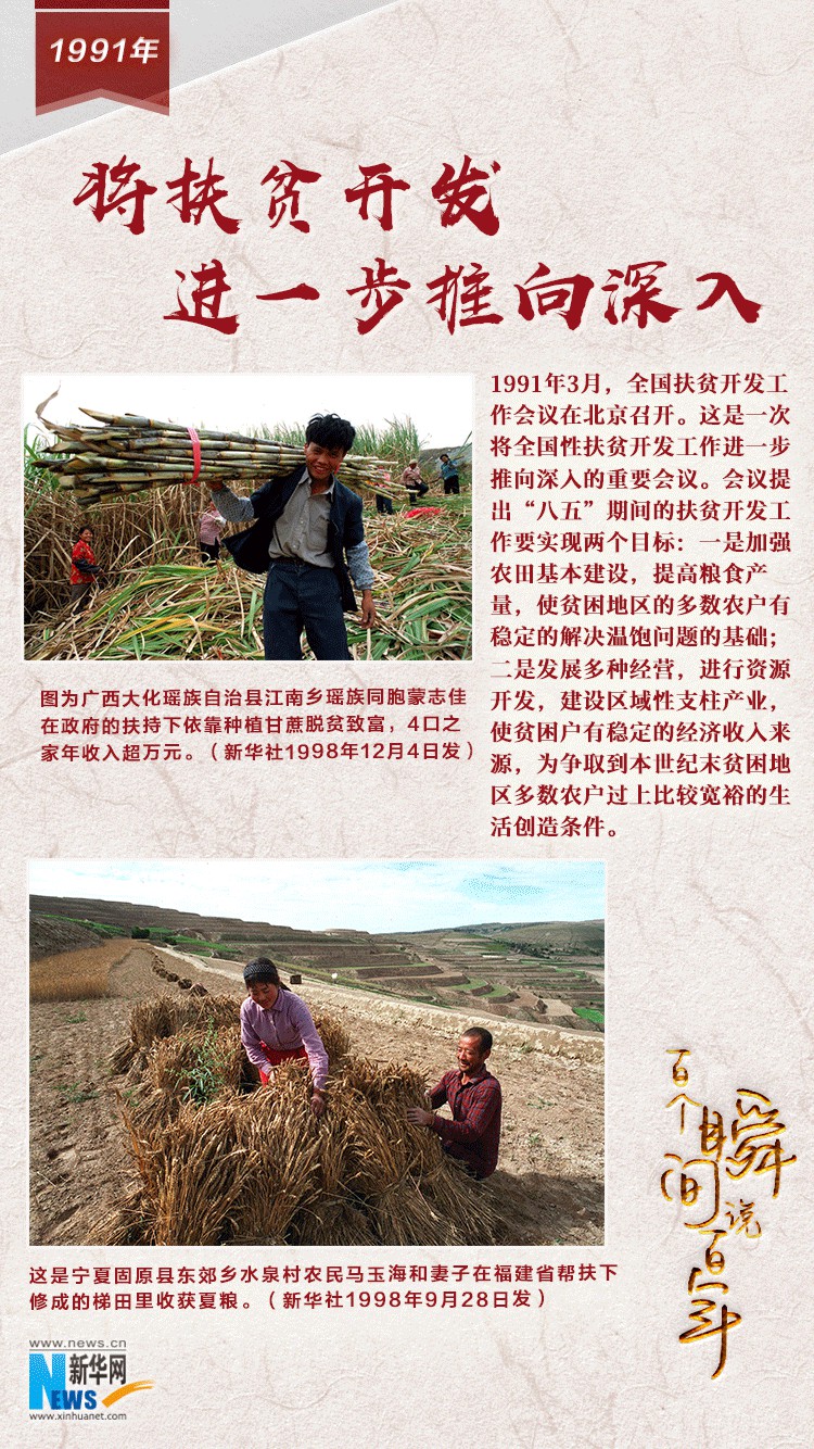 进入20世纪90年代,国务院提出的“七五”期间解决大多数贫困地区群众温饱问题的目标虽已基本实现,但标准低,不稳定,不平衡,差别比较大。1991年3月,全国扶贫开发工作会议在北京召开。这是一次将全国性扶贫开发工作进一步推向深入的重要会议。会议提出“八五”期间的扶贫开发工作,要实现两个目标:一是加强农田基本建设,提高粮食产量,使贫困地区的多数农户有稳定的解决温饱问题的基础;二是发展多种经营,进行资源开发,建设区域性支柱产业,使贫困户有稳定的经济收入来源,为争取到本世纪末贫困地区多数农户过上比较宽裕的生活创造条件。