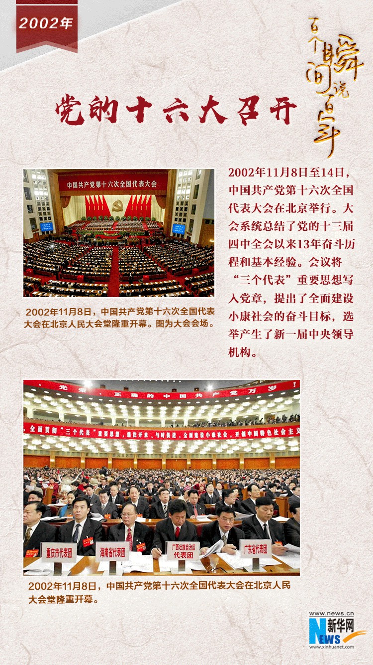 2002年11月8日至14日,中国共产党第十六次全国代表大会在北京举行。大会系统总结了党的十三届四中全会以来13年奋斗历程和基本经验。会议将“三个代表”重要思想写入党章,选举产生了新一届中央领导机构。