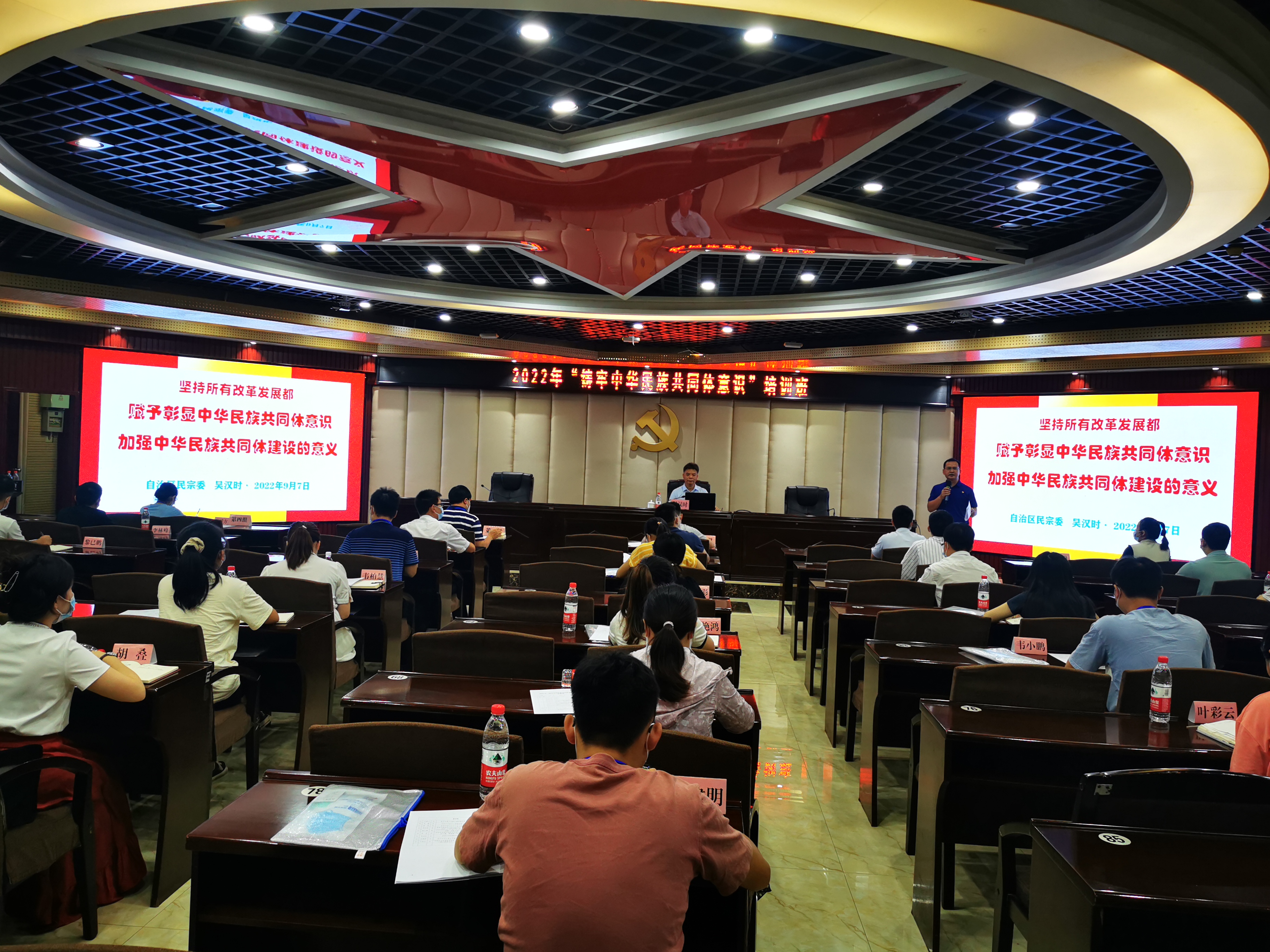 自治区民宗委监督检查处处长吴汉时作了《学习习近平总书记关于铸牢中华民族共同体意识重要论述 做好新时代广西民族工作》的专题报告。吴汉时同志从重温习近平总书记在纪念中国共产主义青年团成立100周年大会上对青年的殷切希望出发,围绕作为新时代的青年应该如何在推动和促进各民族在中华民族大家庭中像石榴籽一样紧紧抱在一起,不断铸牢中华民族共同体意识,加强中华民族共同体建设发挥积极作用这一时代要求,从全面学习贯彻习近平总书记关于加强和改进民族工作的重要思想、铸牢中华民族共同体意识、加强中华民族共同体建设面临的情况和问题,以及我们如何加强中华民族共同体建设方面,与大家进行了交流。专题辅导不仅强化了大家铸牢中华民族共同体的意识,而且启发了开展实际工作的具体思路,让在座的各位学员受益匪浅,受到大家的一致好评。