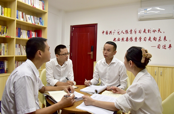 图为王川兴(右二)正在与同事讨论相关案情。周宗波 摄