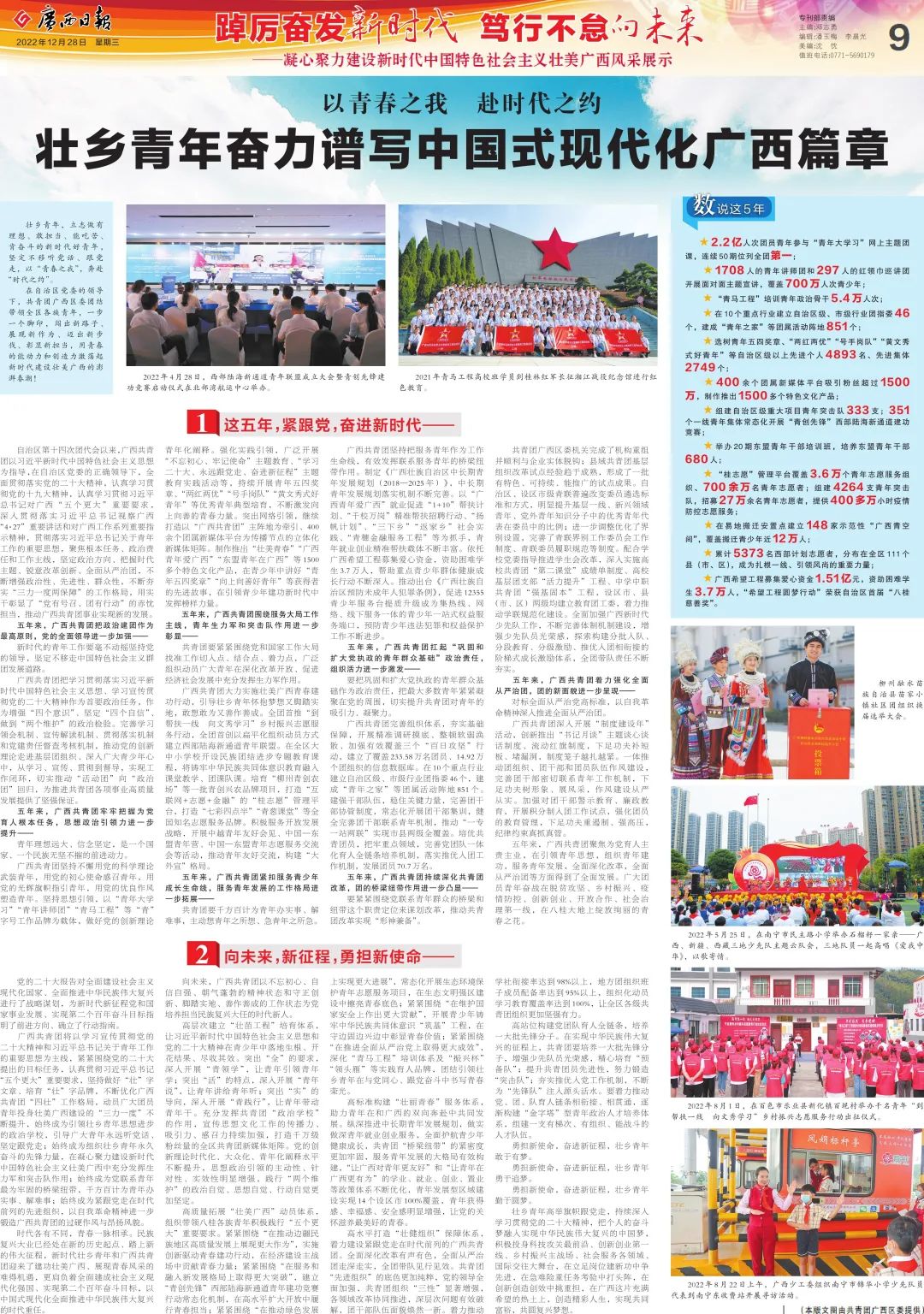 五年来,广西共青团聚焦为党育人主责主业,在引领青年思想,组织青年建功,服务青年发展,全面深化改革,全面从严治团等方面得到了全面发展。广大团员青年奋战在脱贫攻坚、乡村振兴、疫情防控、创新创业、开放合作、社会治理第一线,在八桂大地上绽放绚丽的青春之花。