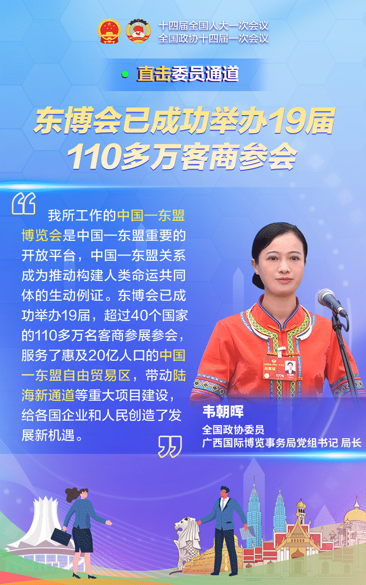 3月11日,全国政协十四届一次会议第三场“委员通道”集体采访活动在北京人民大会堂新闻发布厅举行。全国政协委员、广西国际博览事务局党组书记、局长韦朝晖在“委员通道”接受采访。“东博会已成功举办19届,110多万客商参会”“陆海新通道已成中国与东盟的优良贸易通道”……韦朝晖委员说了什么关键信息,一组动图带你看!