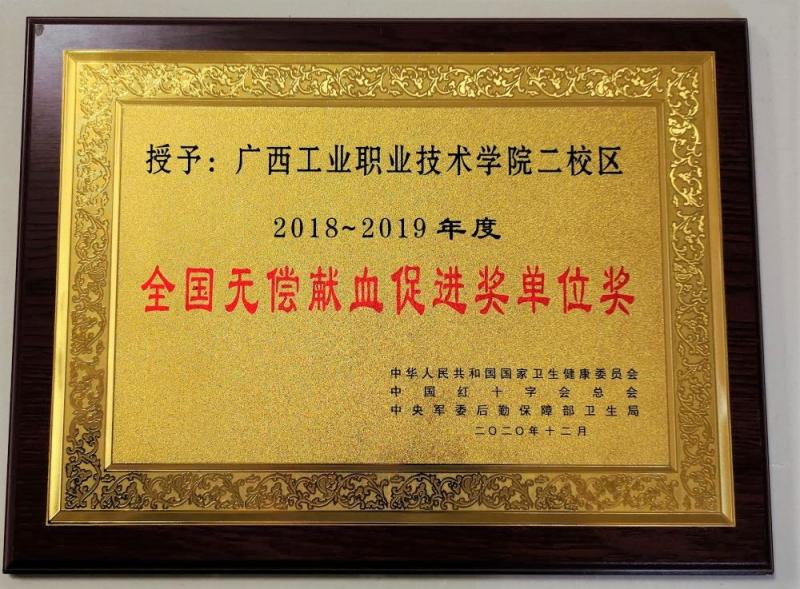 2020年,广西工业职业技术学院获得全国无偿献血促进奖单位奖。