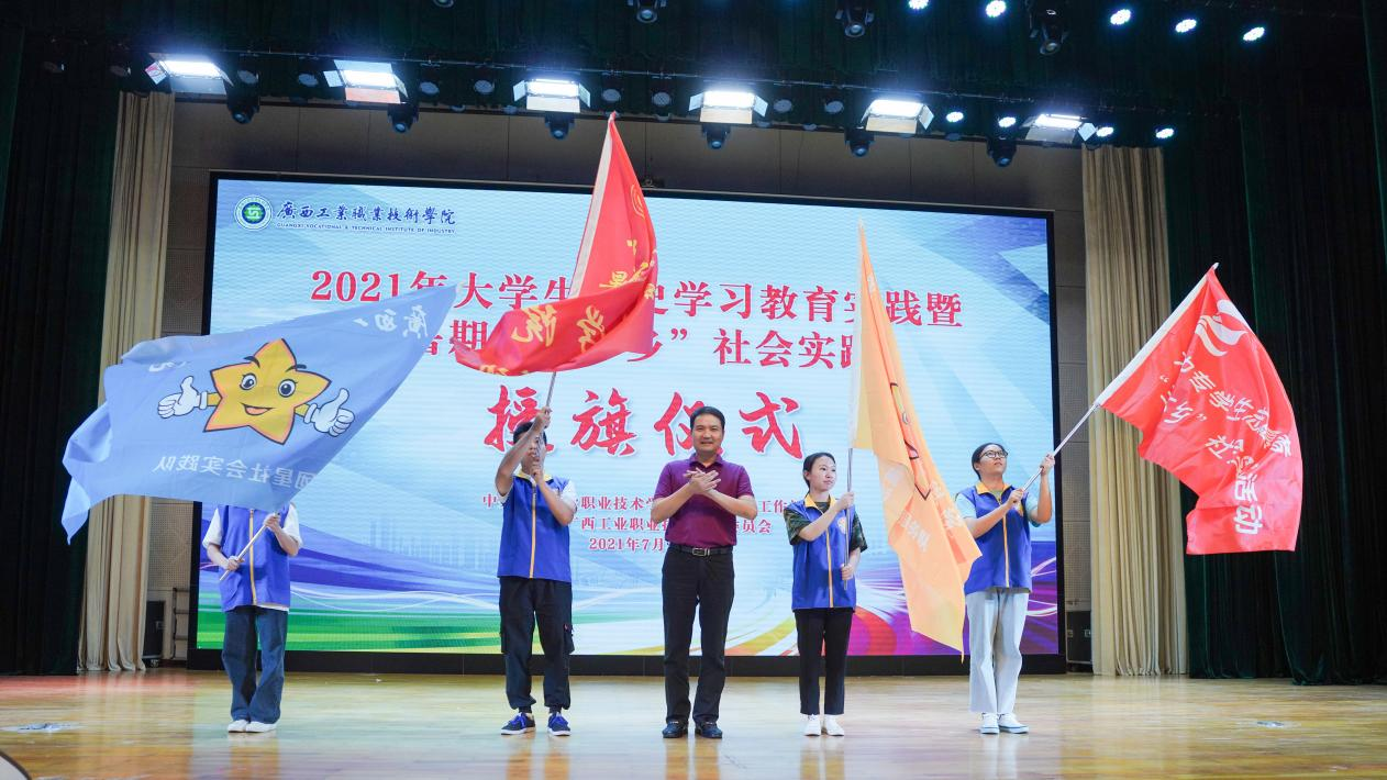 2021年,广西工业职业技术学院领导给“三下乡”社会实践和志愿者服务队授旗。